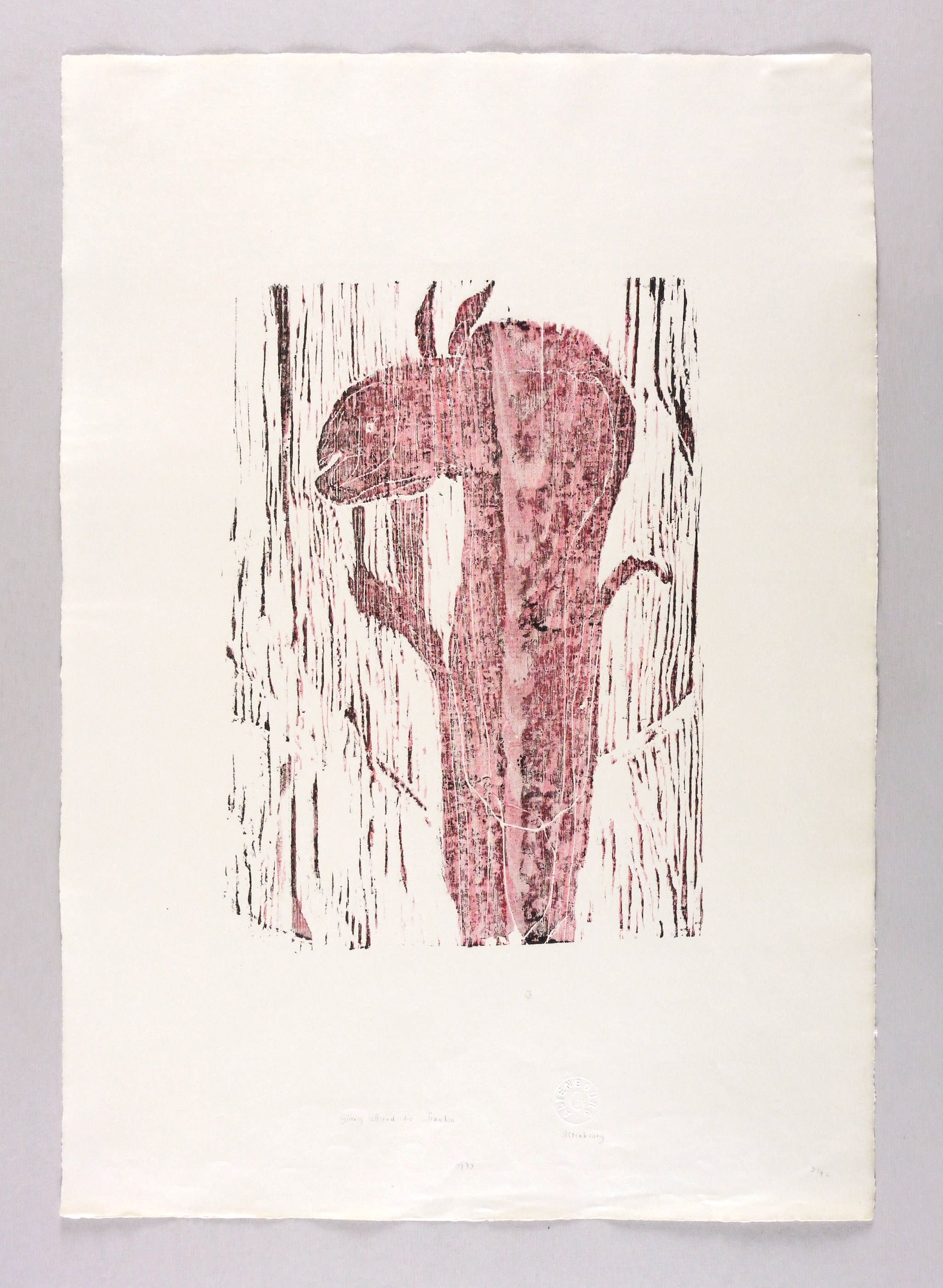 Janda H 170 2 (von 14). – Unterhalb in Feder und Tusche signiert: ″Altenbourg″. Dazu Prägestempel des Künstlers. Links daneben Titel und Jahr: ″Gierig witternd die Trauben // 1973″. Rechts unten Auflagenbezeichnung: ″3/4 c″. – Originalrandiges Exemplar. In den Blatträndern leicht griffspurig. Insgesamt guter Zustand.