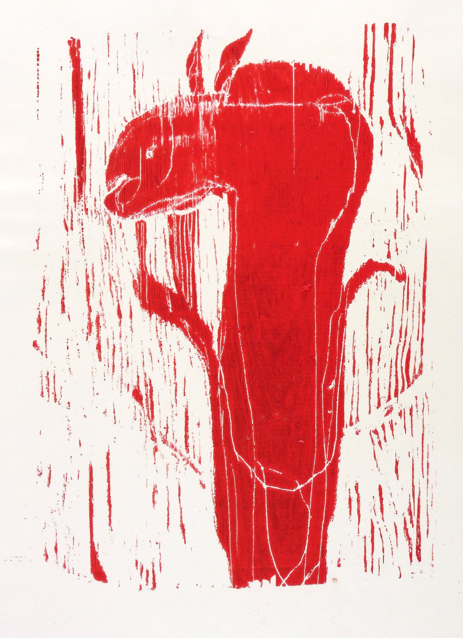 1973. Holzschnitt, in Rot, auf feinstem chamois Spechthausen. – Originale Künstlergrafik, von Gerhard Altenbourg. – Probedruck Nr. 2/2. – 34,0 x 24,4 cm (Darstellung / Druckstock), 61 x 42 cm (Blatt).