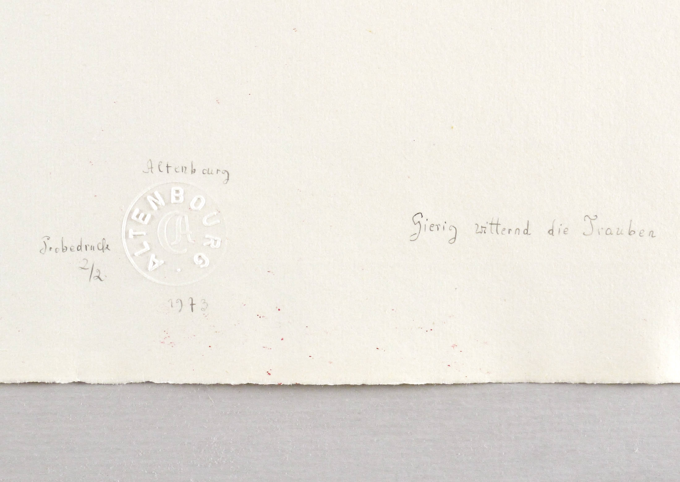 Janda H 170 2 (von 14). – Unterhalb in Feder und Tusche signiert und datiert: ″Altenbourg / 73″. Dazwischen Prägestempel des Künstlers. Links daneben Auflagenbezeichnung: ″Probedruck 2/2″. Rechts gegenüber Titel: ″Gierig witternd die Trauben″. – Einer von 2 Probedrucken in Rot auf Spechthausen-Bütten. So nicht im Werkverzeichnis von Janda gelistet (WVZ Janda, Bd. II, S. 456). - In dieser Farbvariante selten. – Originalrandiges Exemplar. In den Blatträndern seitlich etwas gewellt. Sonst tadellos. Sehr guter Zustand.