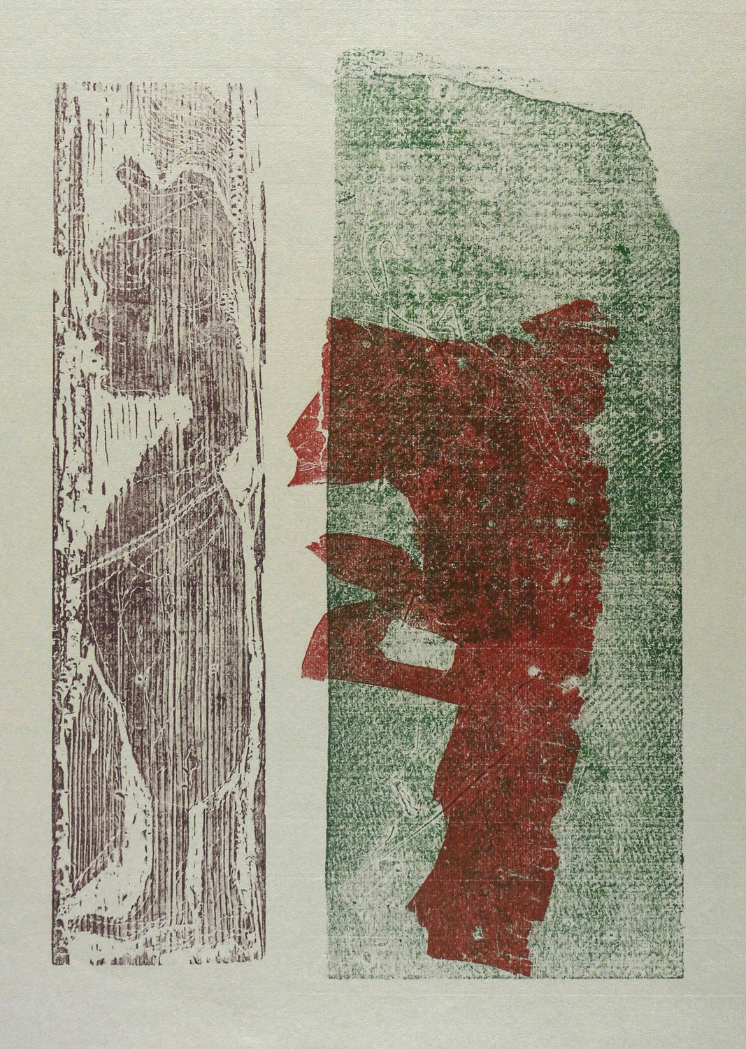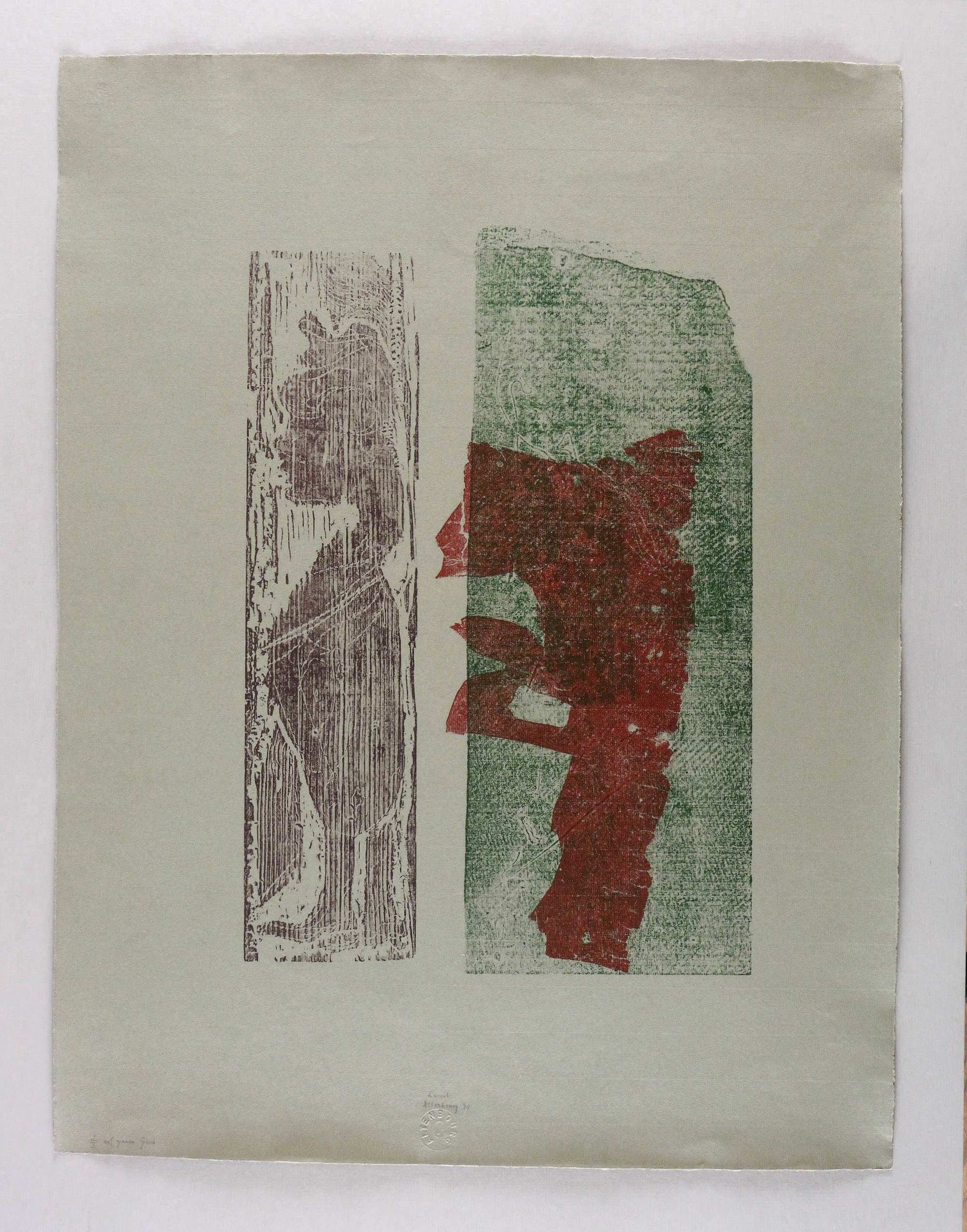 1970. Farbholzschnitt, in Violett, Rot & Grün, auf grauem Hahnemühle. – Originale Künstlergrafik, von Gerhard Altenbourg. – Auflage Exemplar Nr. 2/2. – 42,6 x 29,1 cm (Darstellung / Druckstock), 64 x 49 cm (Blatt).