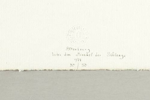 Janda L 165 I 5. – Unterhalb in grauer Feder signiert: ″Altenbourg″. Darüber Trockenstempel des Künstlers. Darunter Titel: ″Unter dem Mirakel der Schlange″. Weiter Jahr und Auflagenbezeichnung: ″1977 / 30/50″. Wasserzeichen von C.M. Fabriano Italia. – Tadellos erhalten. Hervorragender Zustand.