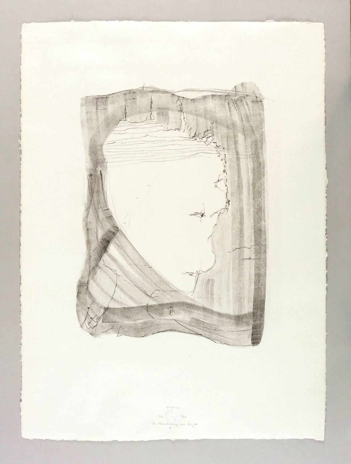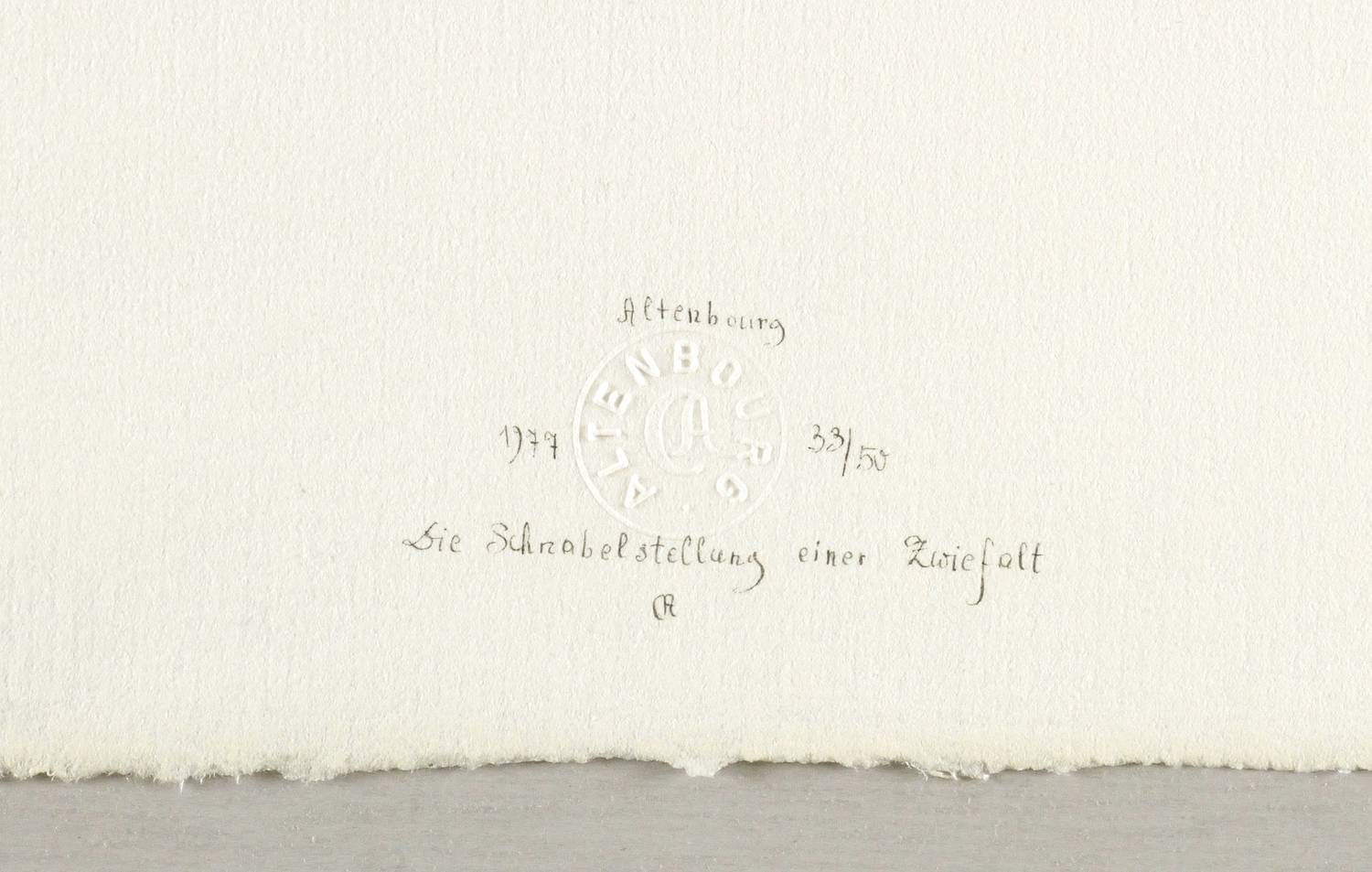 Janda L 166 5. – Unterhalb in grauer Feder signiert: ″Altenbourg″. Darunter Trockenstempel des Künstlers. Weiter Jahr und Auflagenbezeichnung: ″1977 / 33/50″. Dazu Titel und Monogramm: ″Die Schnabelstellung einer Zwiefalt / GA″. Wasserzeichen von C.M. Fabriano Italia. – Tadellos erhalten. Hervorragender Zustand.