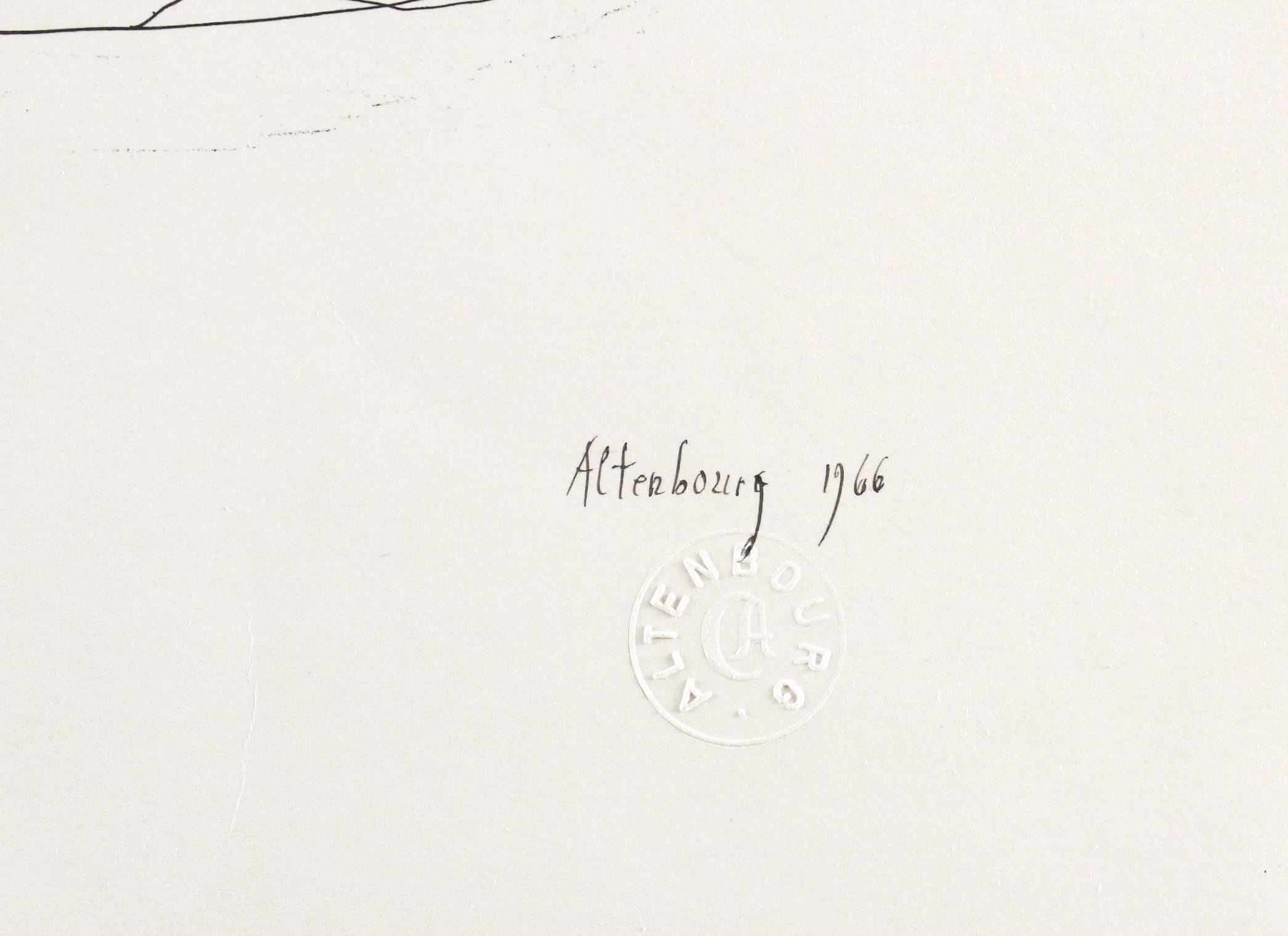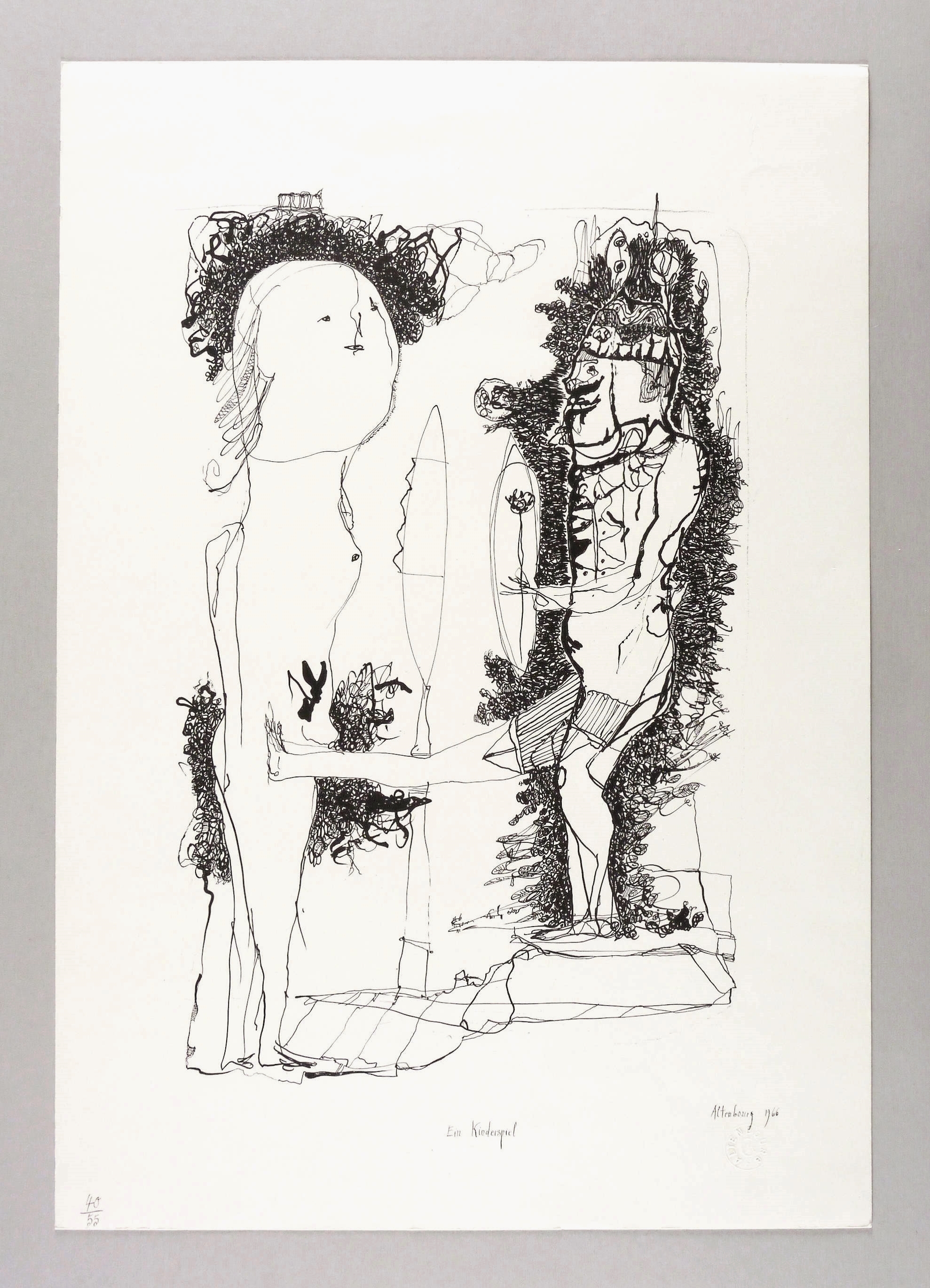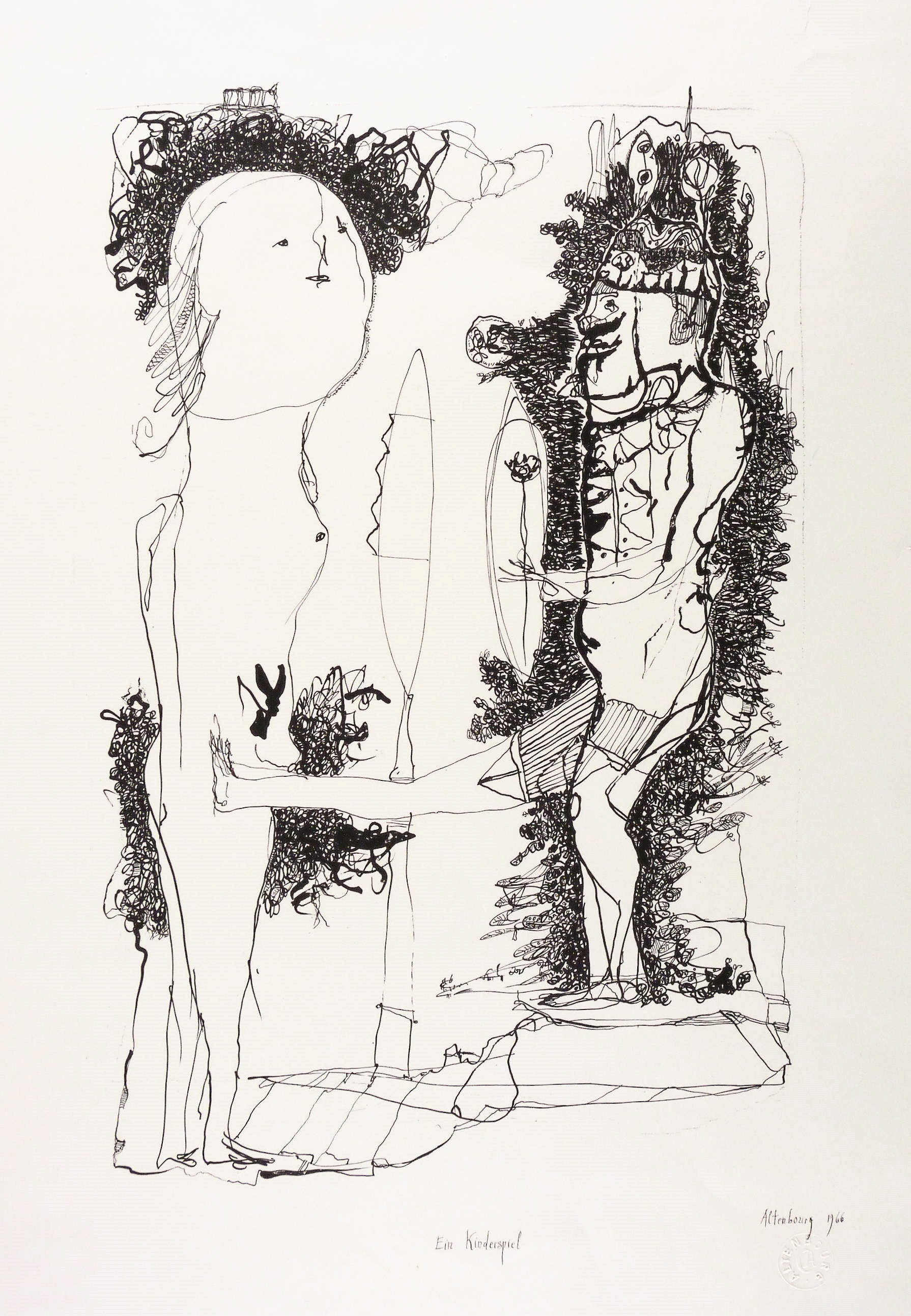 Janda L 114. – Rechts unten in schwarzer Feder signiert und datiert: ″Altenbourg 1966″. Dazu Trockenstempel des Künstlers. In der Blattecke links unten Auflagenbezeichnung: ″40/55″. Mittig Titel: ″Ein Kinderspiel″. – Ohne Makel. Sehr guter Zustand.