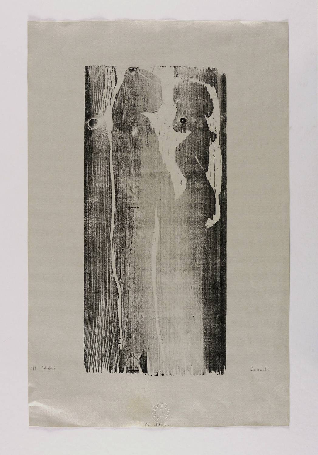 1972. Holzschnitt, in Schwarz, auf hellgrau getöntem Ingres. – Originale Künstlergrafik, von Gerhard Altenbourg. – Probedruck Exemplar. Nr. 3/5. – 36,2 x 16,6 cm (Darstellung / Druckstock), 48 x 31 cm (Blatt).