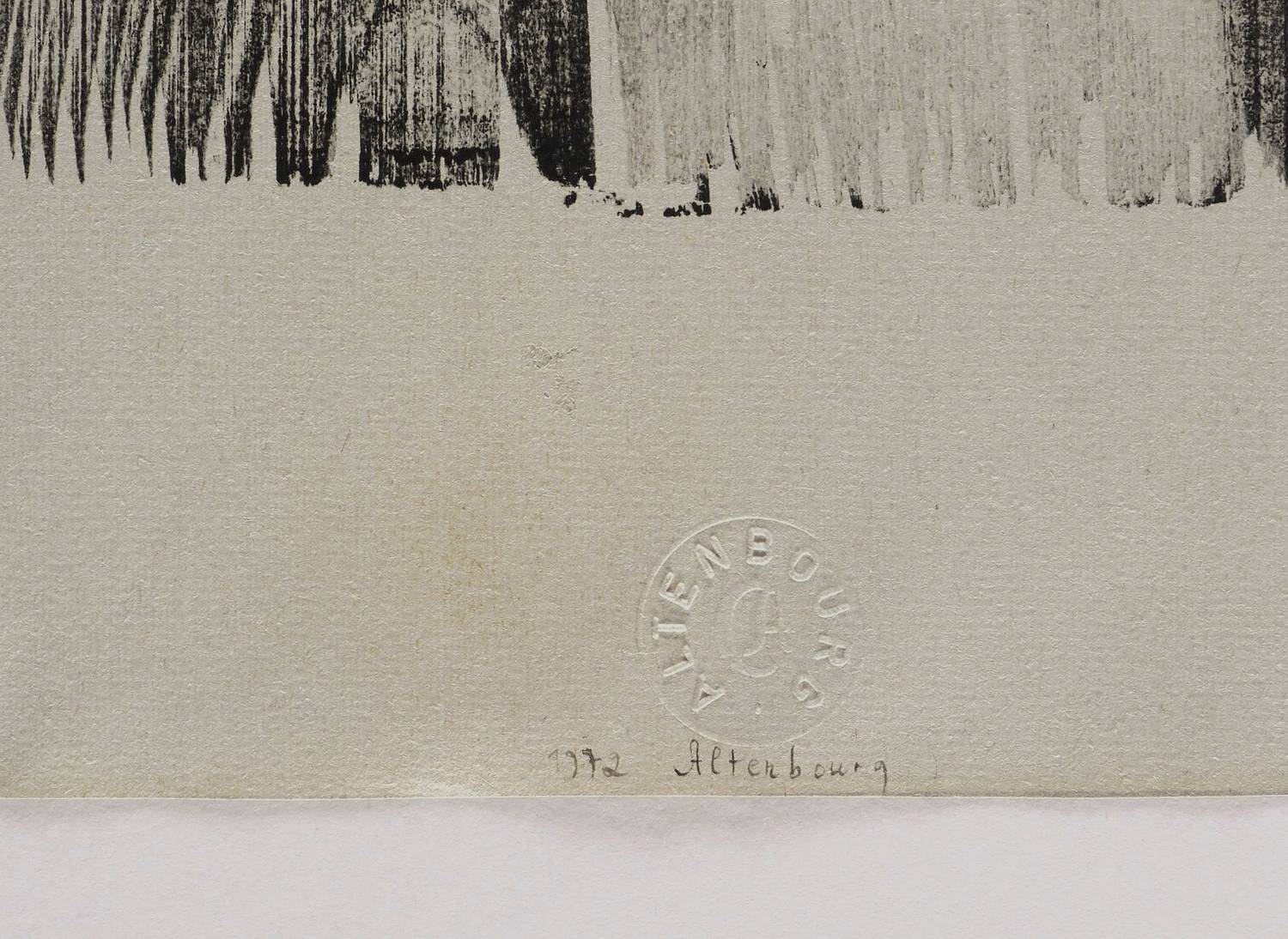 Janda H 156 1. – Im unteren Blattrand in schwarzer Tusche datiert und signiert: ″1972 Altenbourg″. Rechts Titel: ″Zueinander″. Links Auflagenbezeichnung: ″3/5 Probedruck″. – Einer von nur 5 Abzügen auf diesem Tonbütten. – Leichte Lagerspuren, linke untere Blattecke mit Knickspuren. Insgesamt guter Zustand.