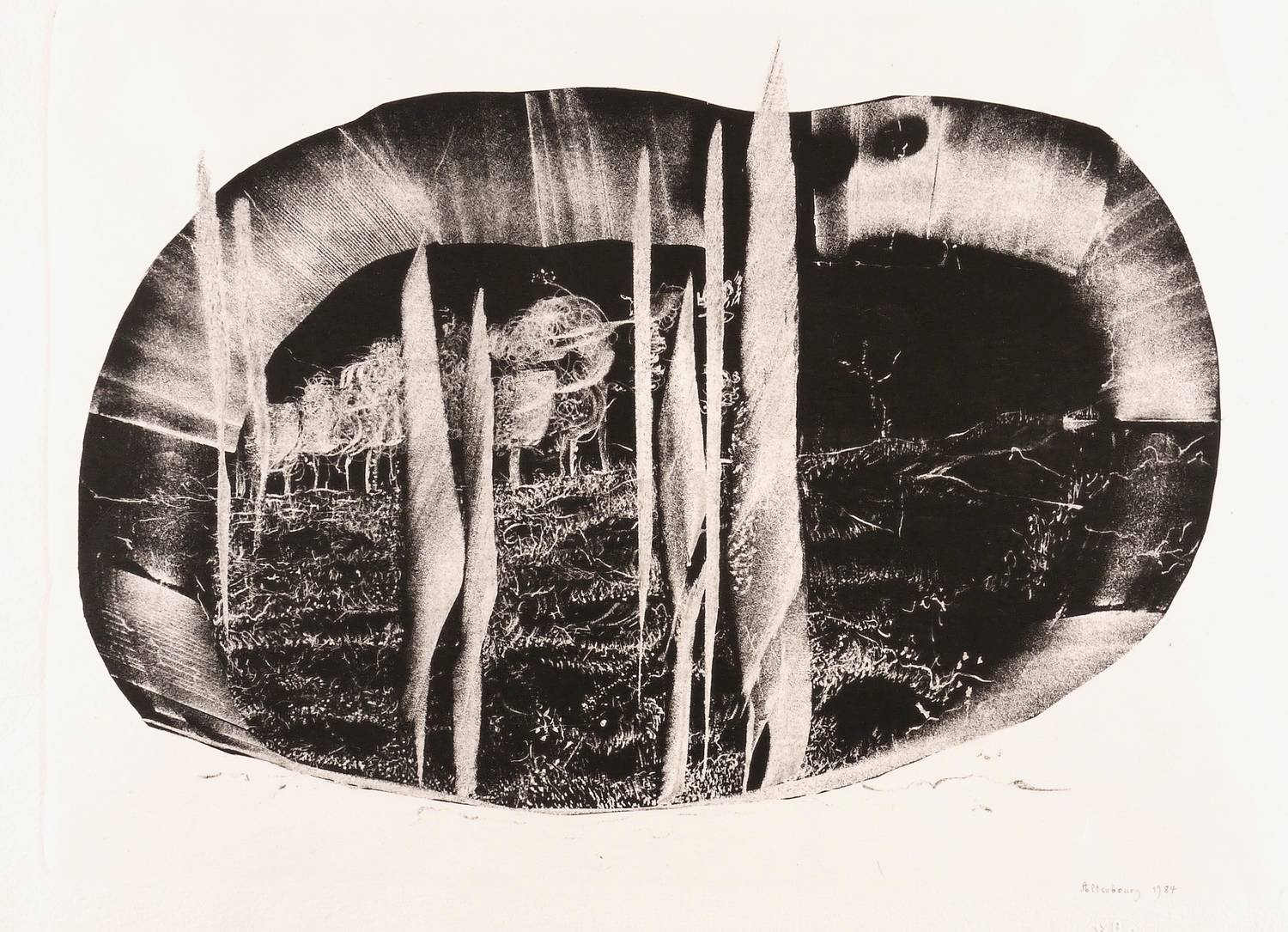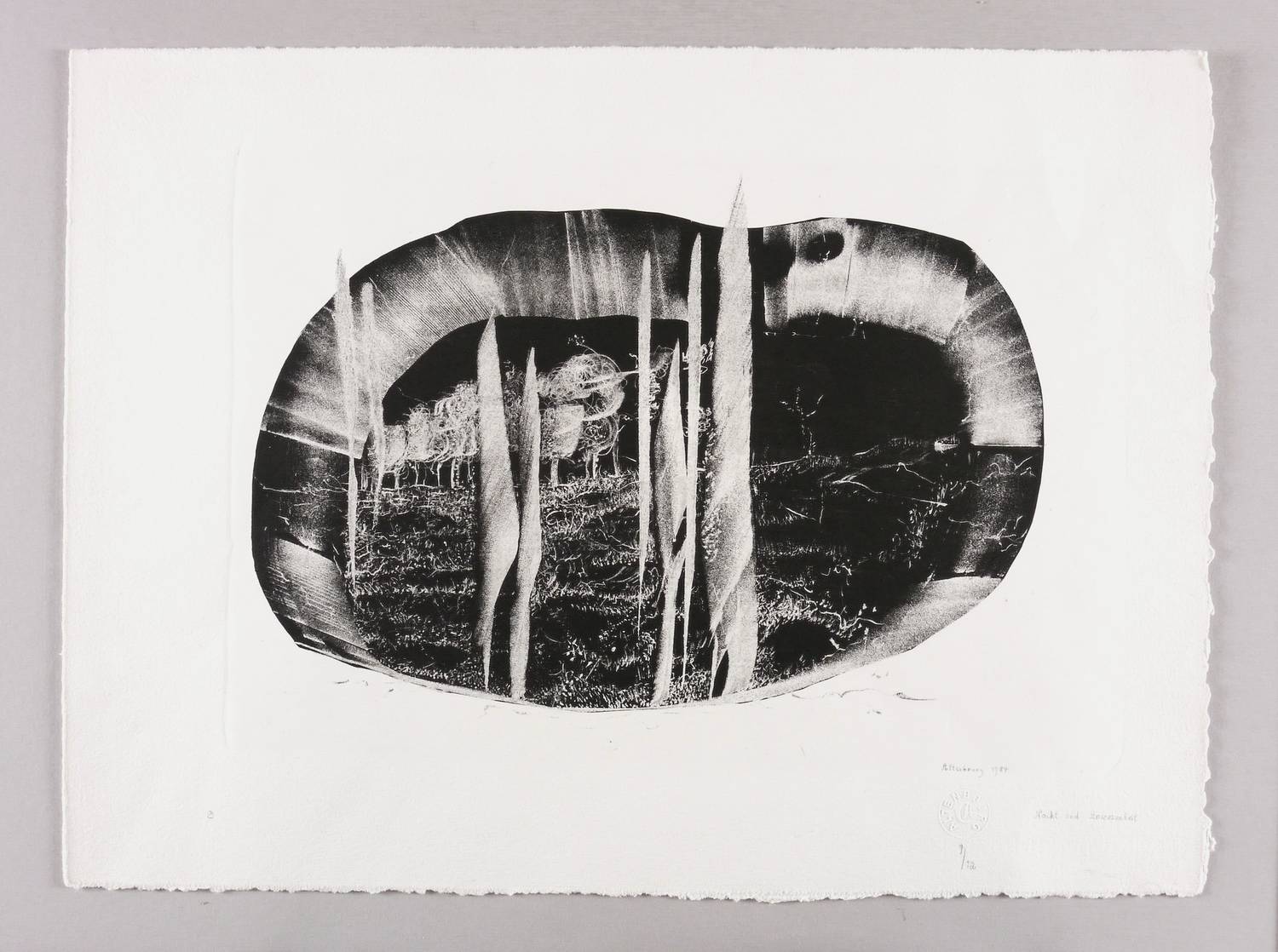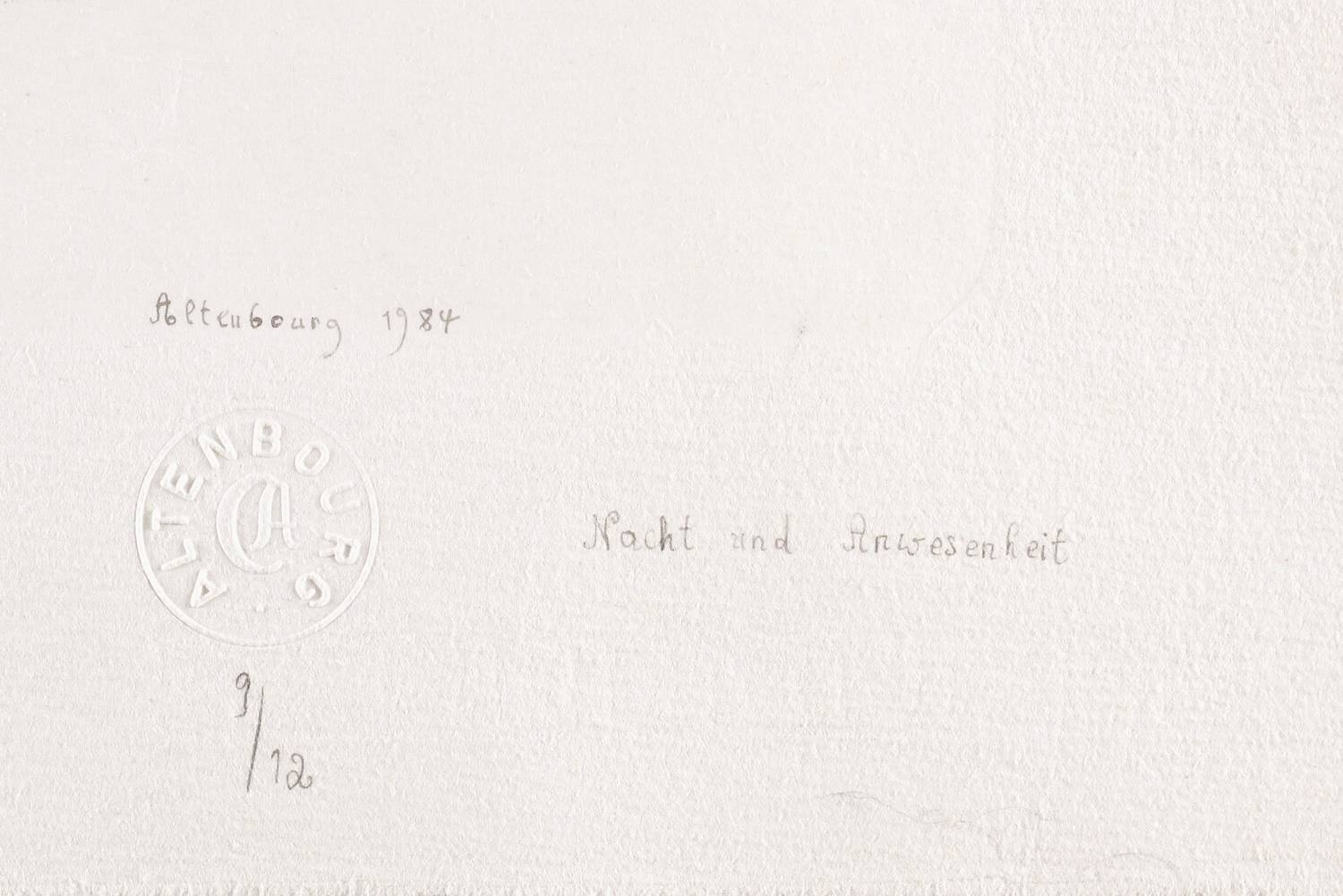 Janda L 183 II 4. – Rechts unten in schwarzer Feder signiert und datiert: ″Altenbourg 1984″. Darunter Blindstempel des Künstlers. Rechts daneben Titel: ″Nacht und Anwesenheit″. Darunter Auflagenbezeichnung: ″9/12″. Links unten Monogramm: ″GA″. Wasserzeichen der Hahnemühle. – Tadellos und ohne Makel. Sehr guter Zustand.