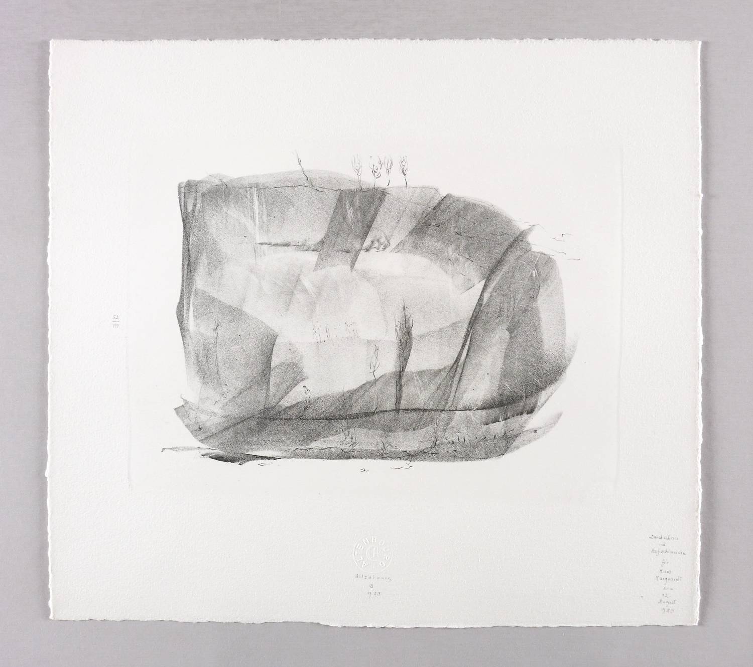 Janda L 170 I 3. – Unterhalb in grauer Feder signiert, monogrammiert und datiert: ″Altenbourg / GA / 1980″. Dazu Trockenstempel des Künstlers. Am linken Blattrand Auflagenbezeichnung: ″52/111″. Rechts unten Titel: ″Durchschau und Aufschimmern / für Hans Marquardt zum 12. August 1980.″ – Gewidmet Hans Marquardt (1920-2004), Verleger und Leiter des Reclam Verlag Leipzig, Herausgeber zahlreicher originalgrafischer Mappenwerke der DDR. – Tadellos und ohne Makel. Sehr guter Zustand.