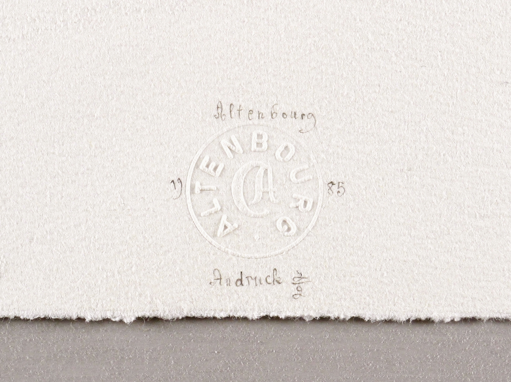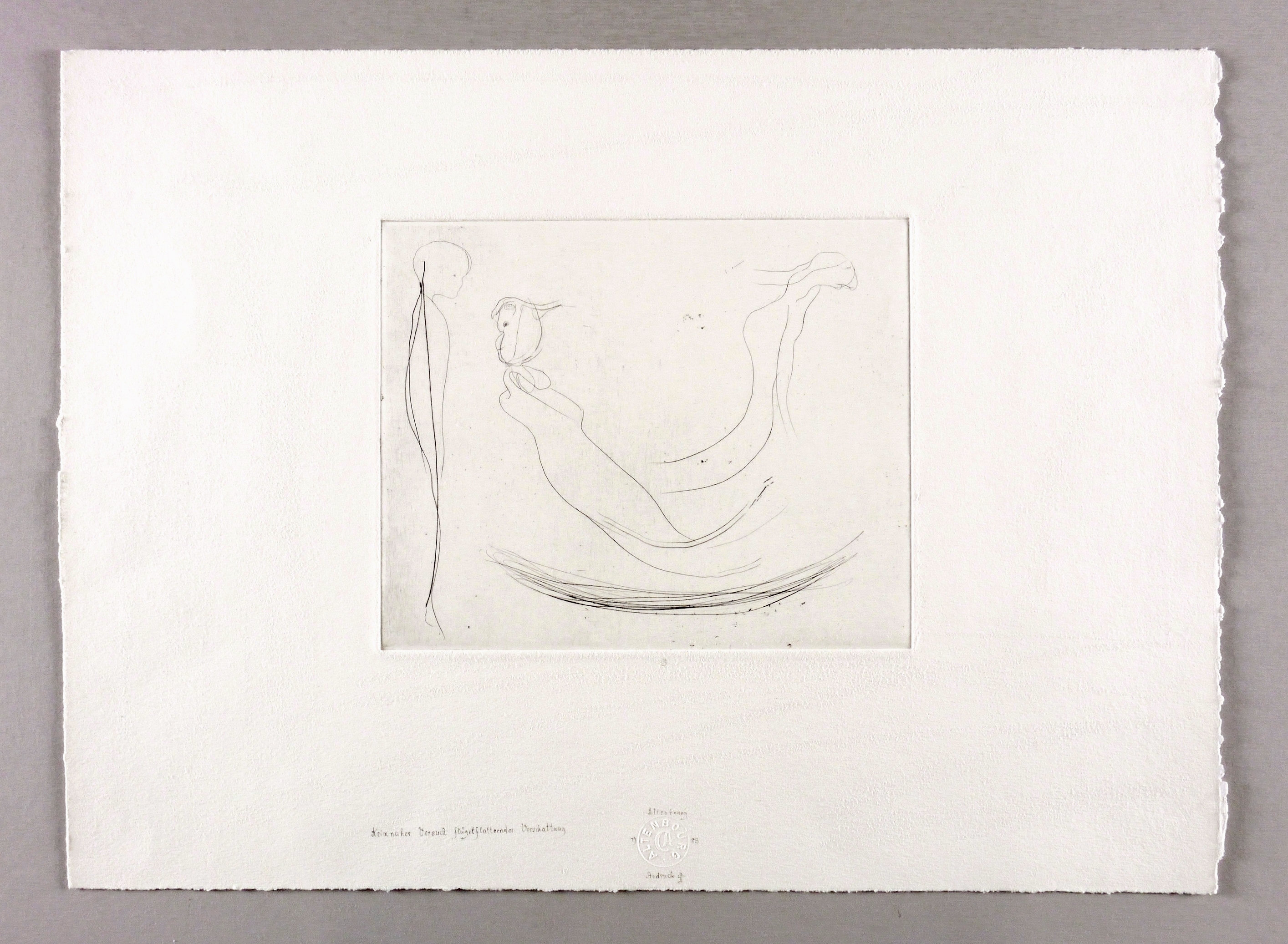 Janda R 56 1. – Im Blattrand unten in Bleistift signiert und datiert: ″Altenbourg 1985″. Dazu Blindstempel des Künstlers und Auflagenbezeichnung: ″Andruck 2/2″. Links daneben Titel: ″Keimnaher Versuch flügelflatternder Verschattung″. Wasserzeichen der Hahnemühle. – Druck von Thomas Ranft und Matthias Mann. - Exemplare der Auflage im Lindenau-Museum Altenburg, Kupferstichkabinett Berlin, in der Kunsthalle Hamburg und der Staatsgalerie Stuttgart. - Selten. – Breiter unbeschnittener Rand. Tadellos. Sehr guter Zustand.