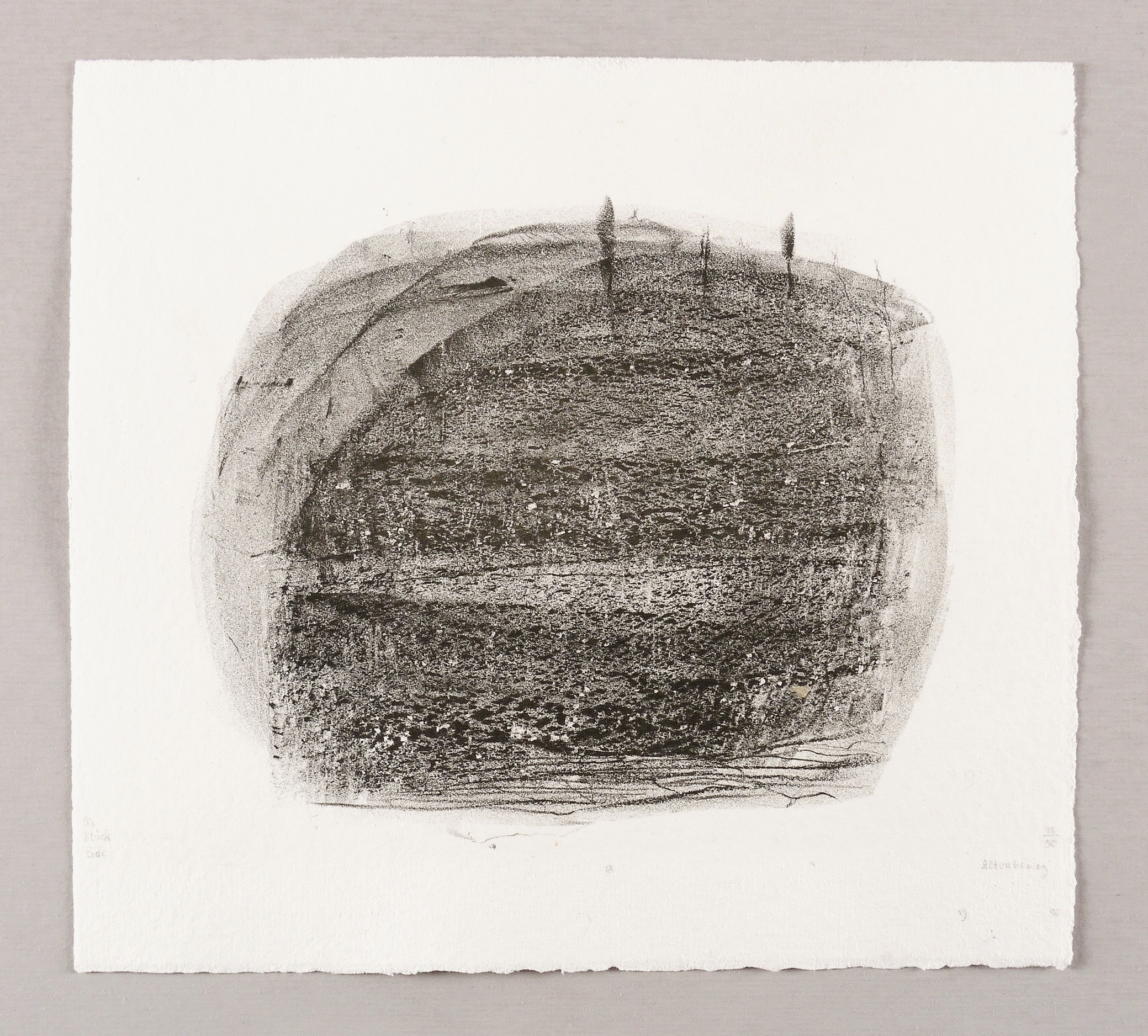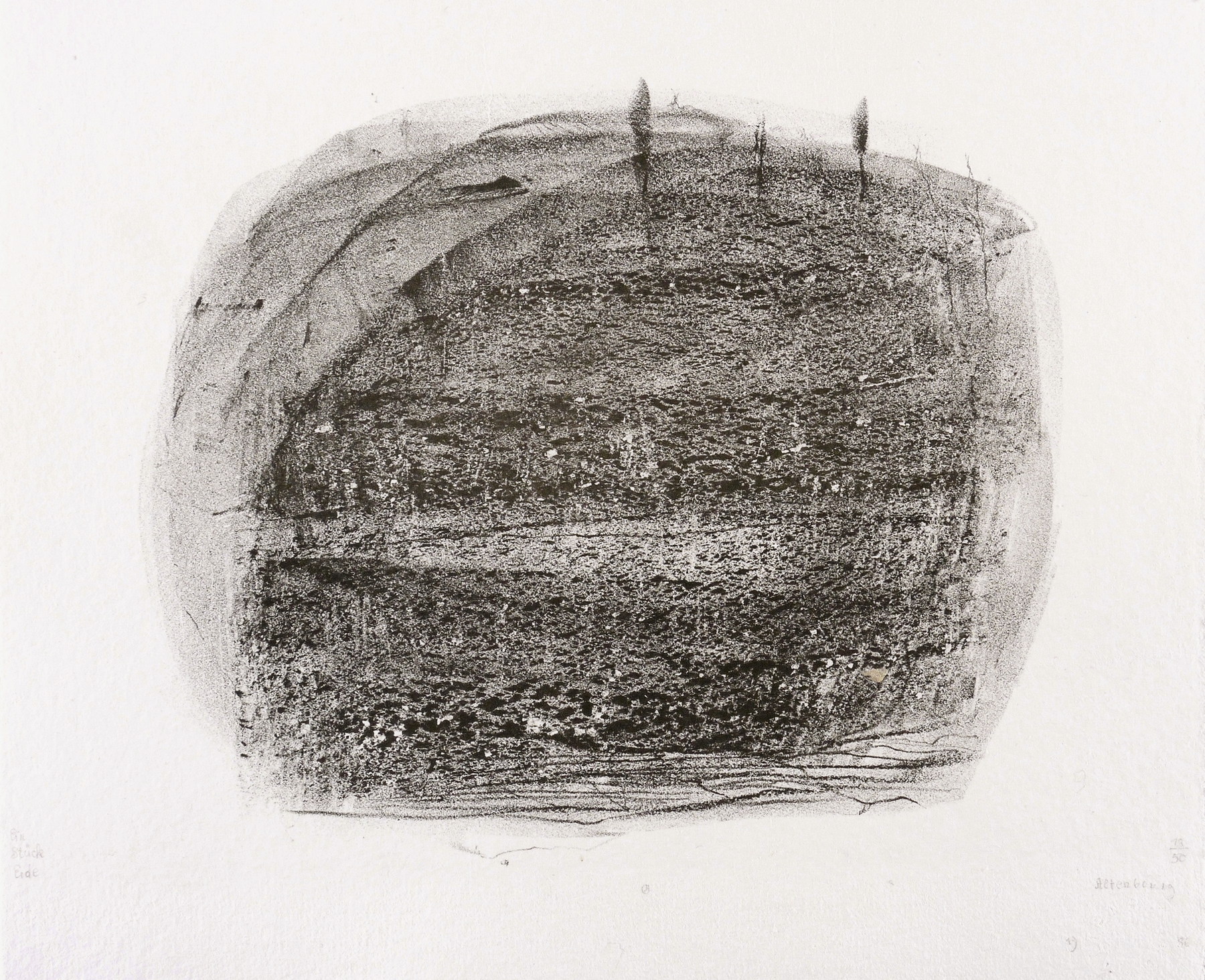 Janda L 195 B 6. – Rechts unten in Bleistift signiert und datiert: ″Altenbourg / 1986″. Dazu Trockenstempel des Künstlers und Auflagenbezeichnung: ″18/50″. Im linken Blattrand gegenüber Titel: ″Ein Stück Erde″. Unterhalb der Darstellung Monogramm: ″GA″. – Die ursprüngliche Fassung des Titels lautete ″Ein Stück heilige Erde″. – Tadellos erhalten. Sehr guter Zustand.