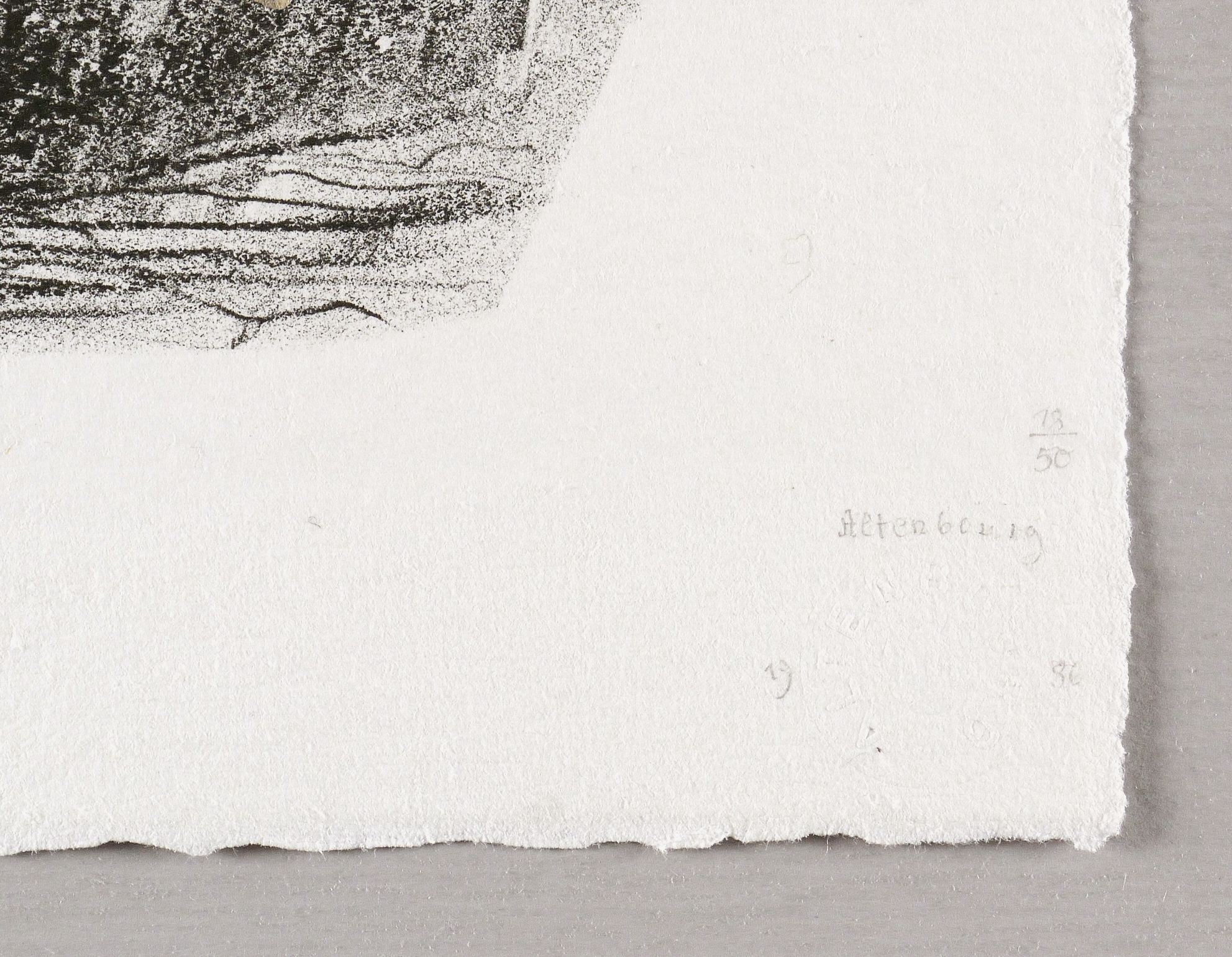 1986. Lithografie / Kreidelithografie, in Schwarz, auf schwerem hellchamois Velin. – Originale Künstlergrafik, von Gerhard Altenbourg. – Auflage Exemplar Nr. 18/50. – 19,9 x 23,2 cm (Darstellung / Druckbild), 28 x 31 cm (Blatt).