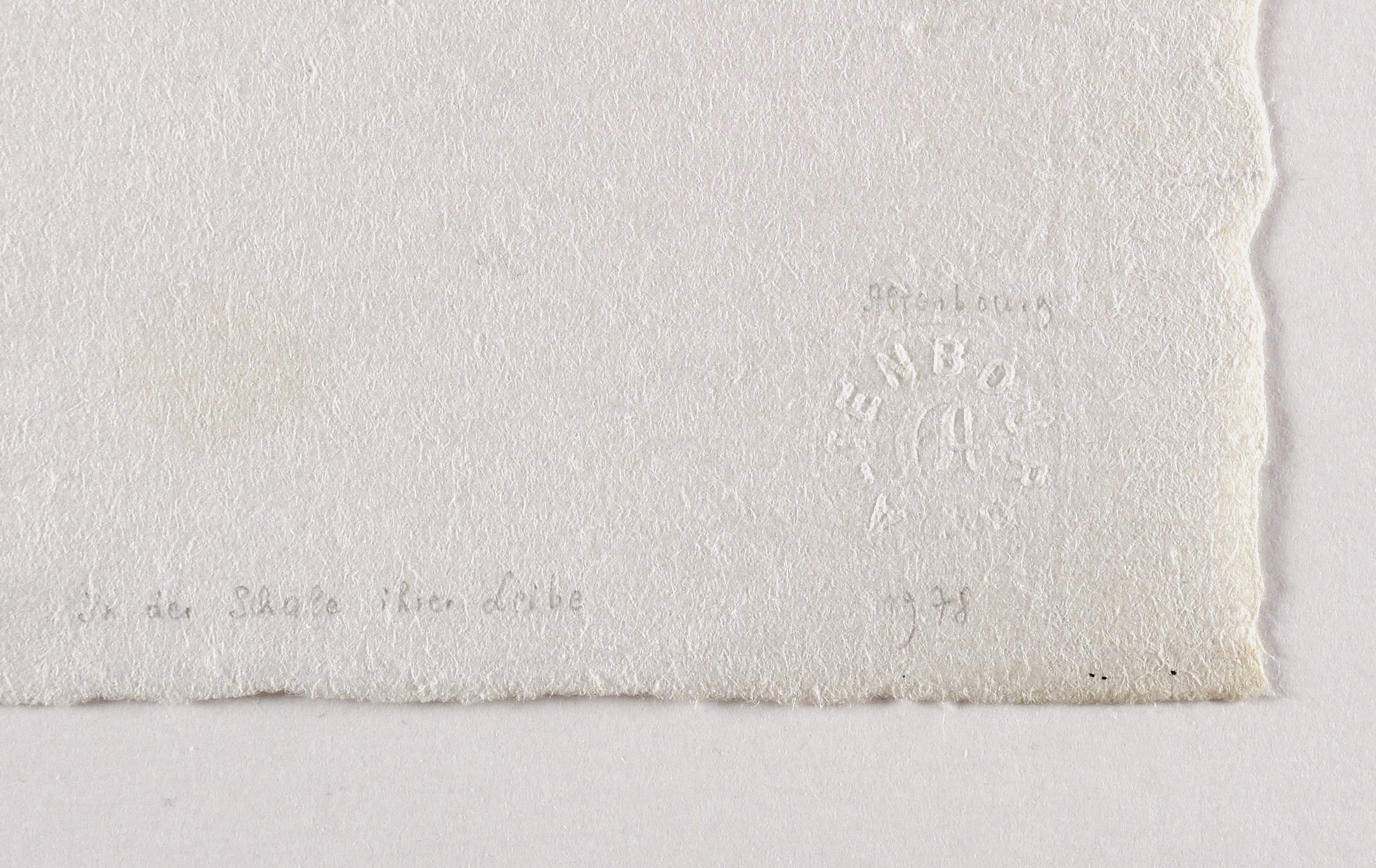 Janda H 202 I 7. – Rechts unten in Bleistift signiert: ″Altenbourg″. Dazu Prägestempel des Künstlers. Darunter Jahr: ″1978″. Im rechten Blattrand Auflagenbezeichnung: ″6/50″. Im unteren Blattrand rechts Titel: ″In der Schale ihrer Leiber″. – Tadellos erhalten. Sehr guter Zustand.
