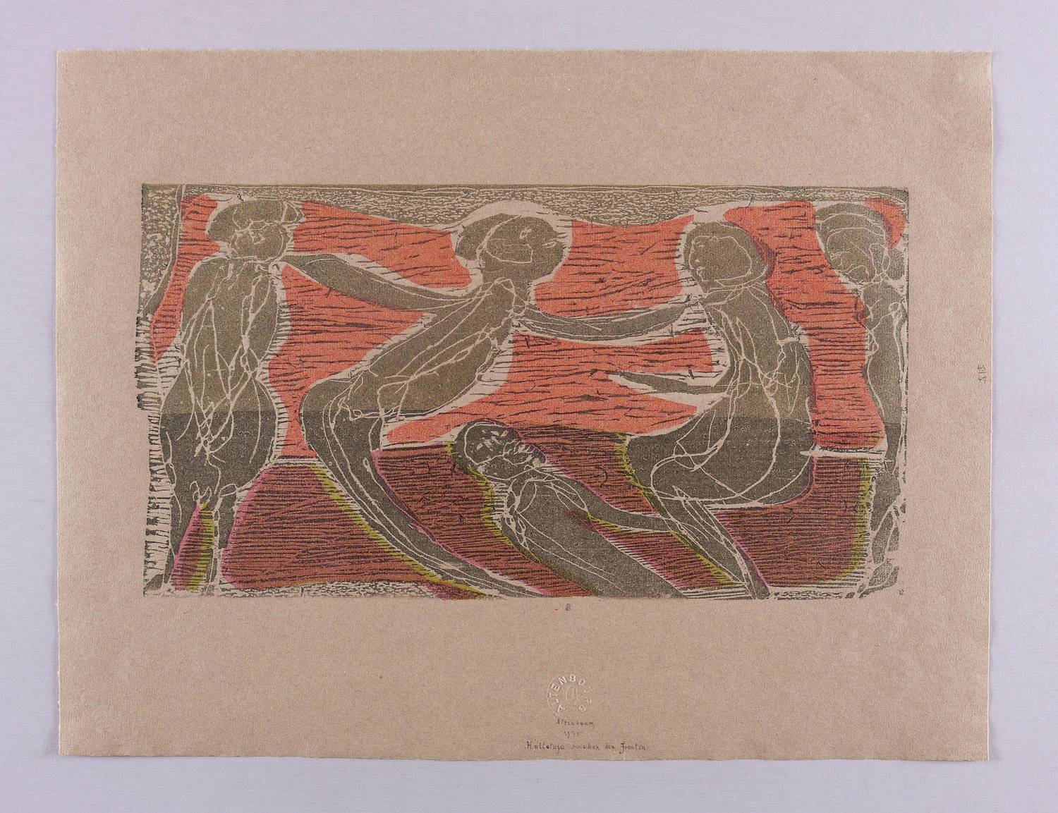1978. Farbholzschnitt, in Grauoliv, Grün, Karminrot & Orange, auf braun getöntem Ingres. – Originale Künstlergrafik, von Gerhard Altenbourg. – Auflage Exemplar Nr. 45/47. – 20,5 x 38,3 cm (Darstellung / Druckstock), 36 x 47 cm (Blatt).