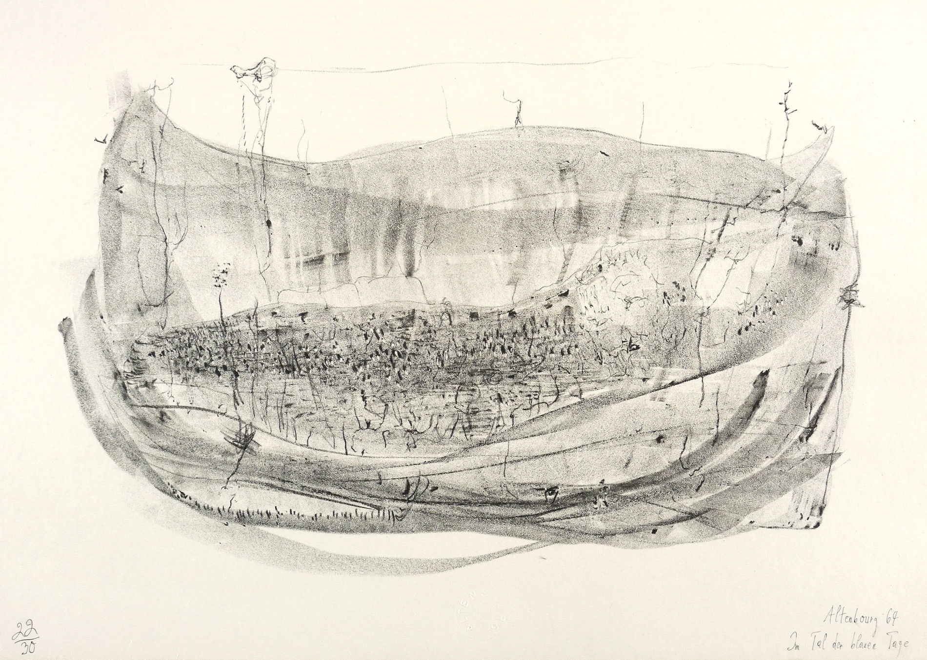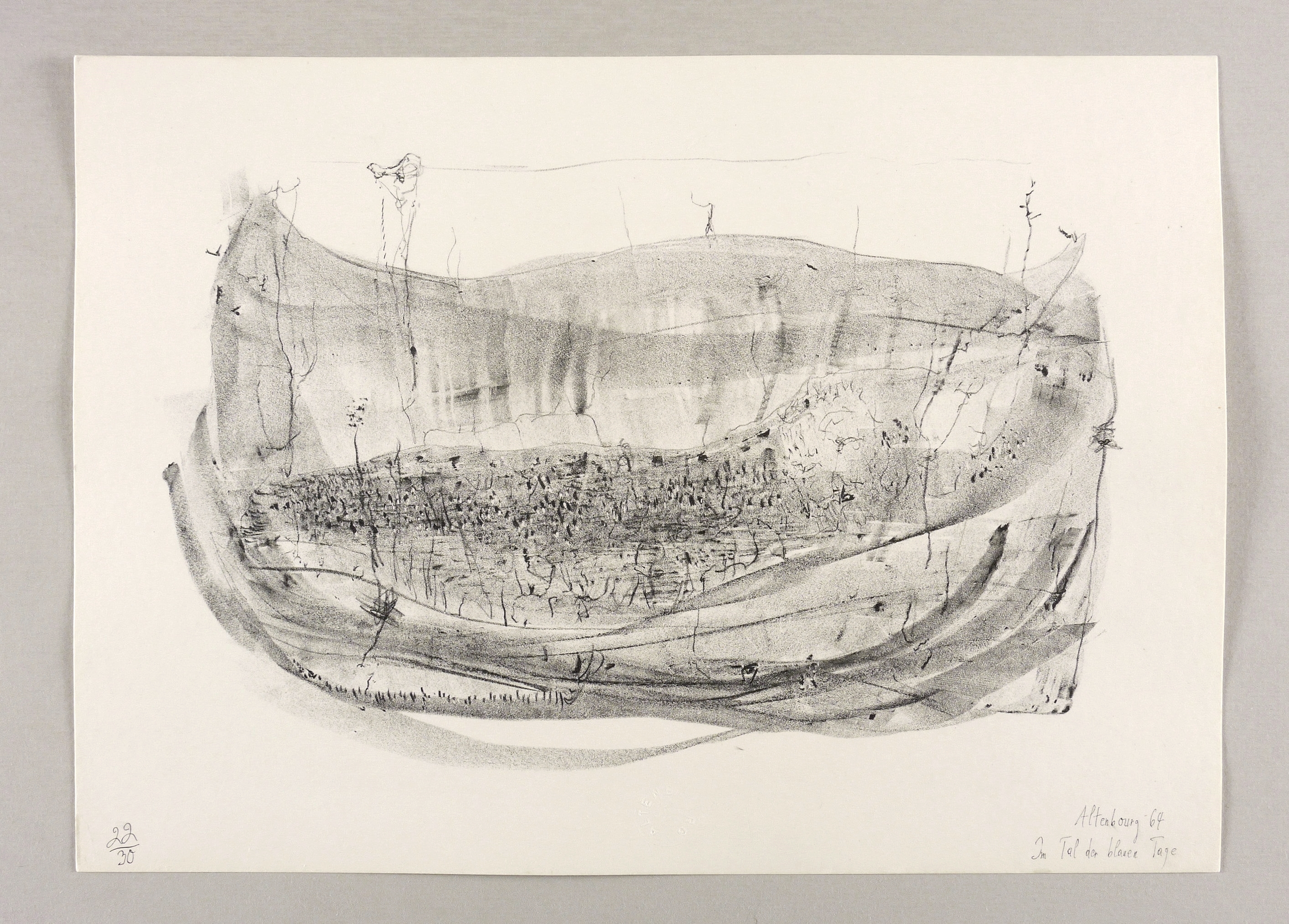 Janda L 93. – Rechts unten in schwarzer Feder signiert und datiert: ″Altenbourg 64″. Dazu Titel: ″Im Tal der blauen Tage″: Links Auflagenbezeichnung: 22/30″. Mittig Blindstempel des Künstlers. – Sehr guter Zustand.