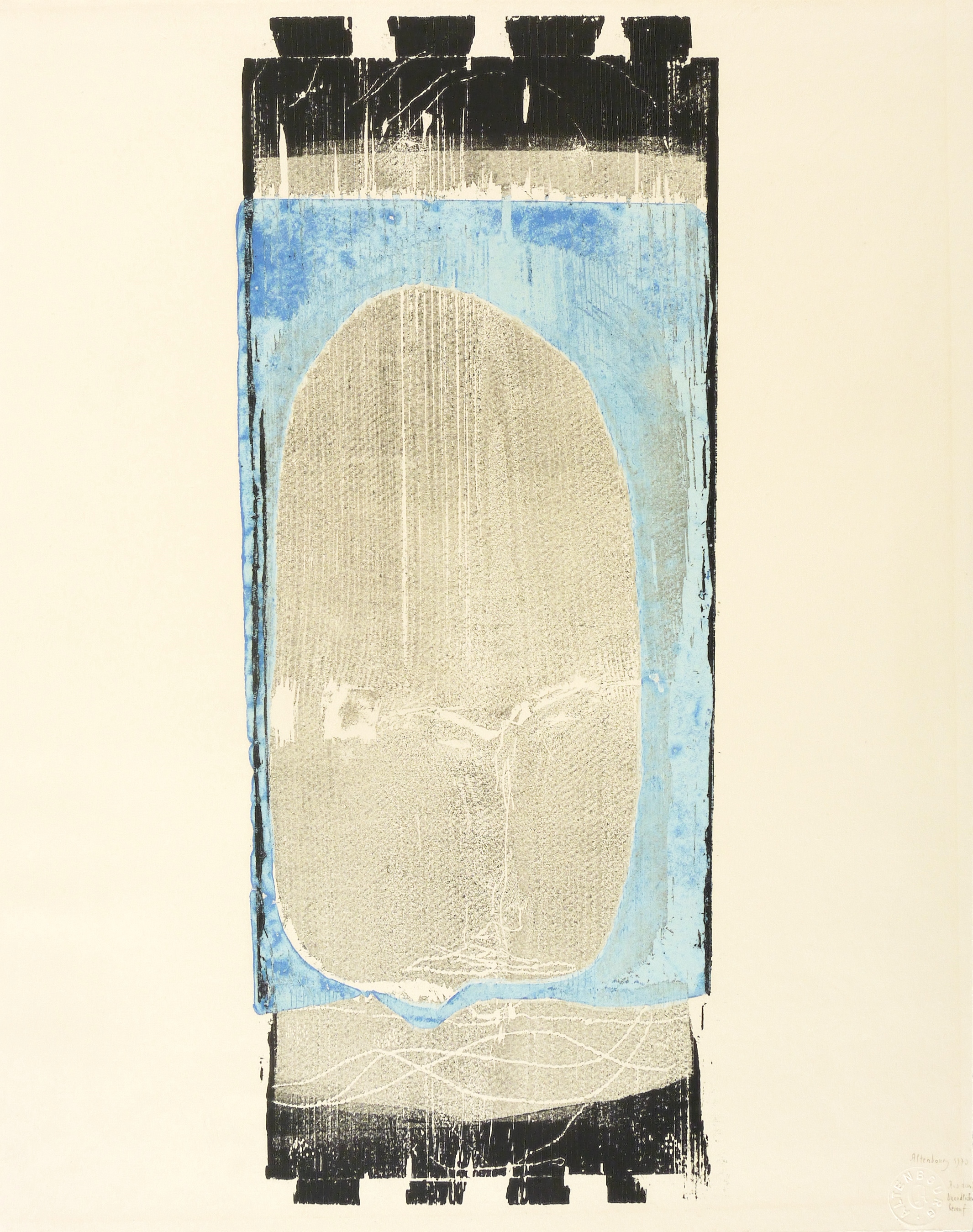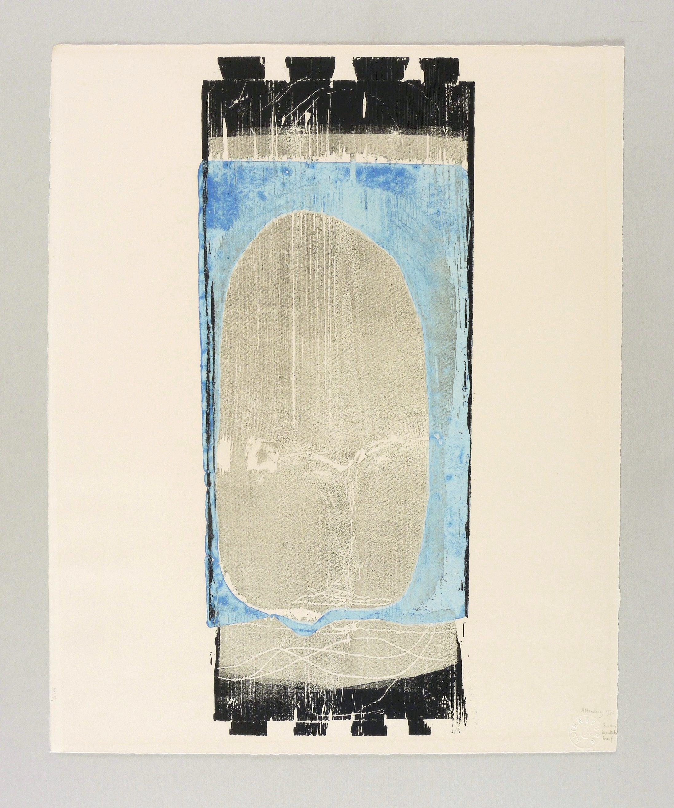 1973. Farbholzschnitt, in Schwarz, Grau & Blau, auf festem Büttenpapier. – Originale Künstlergrafik, von Gerhard Altenbourg. – Auflage Exemplar Nr. 15/27. – 47,5 x 19,3 cm (Darstellung / Druckbild), 50 x 40 cm (Blatt).
