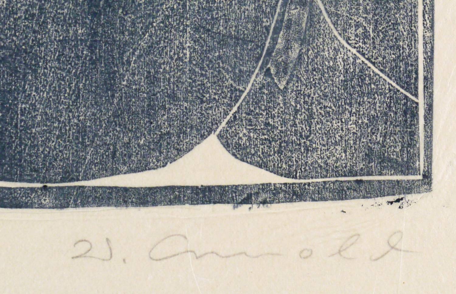 1943. Holzschnitt, Aquarellfarbe in Taubenblau, auf Japanpapier. – Originale Künstlergrafik, von Walter Arnold. – 26,0 x 21,6 cm (Darstellung / Druckstock), 42 x 30 cm (Blatt), 50 x 38 cm (Trägerkarton).