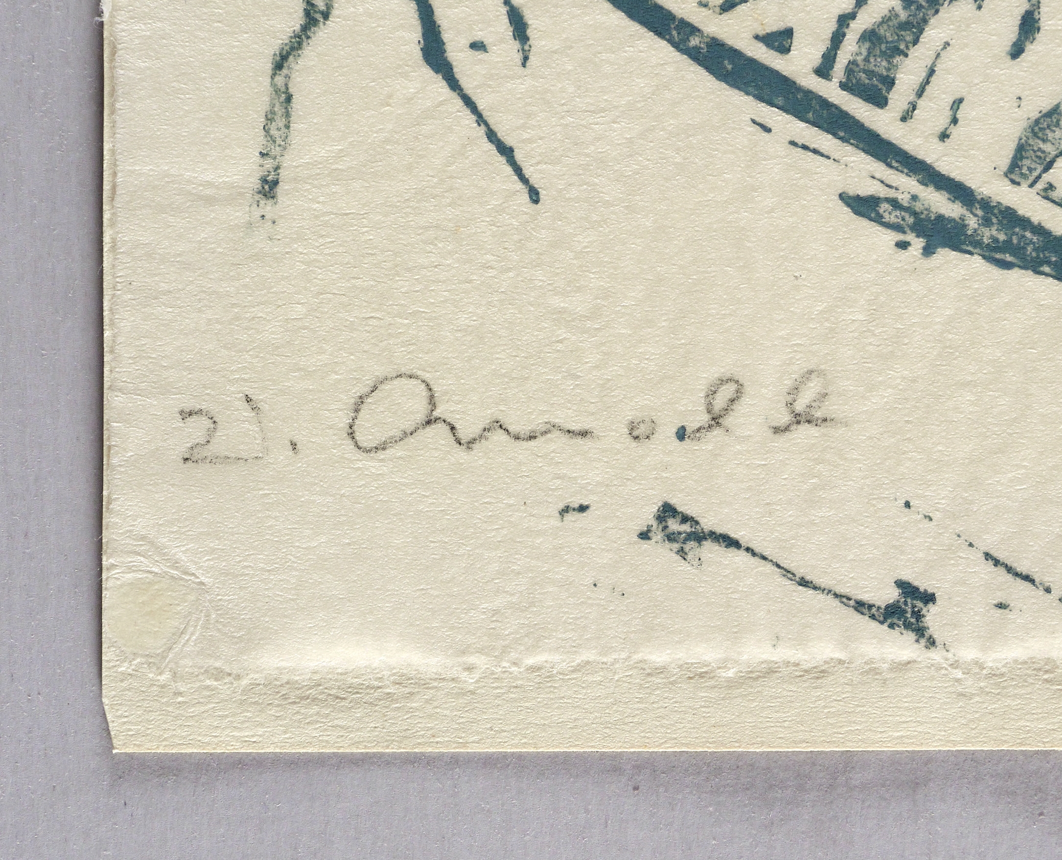 1944. Holzschnitt, Aquarellfarbe in Blaugrau, auf hellgelbem Japan. – Originale Künstlergrafik, von Walter Arnold. – 28,9 x 19,5 cm (Darstellung / Druckstock), 29,5 x 21,0 cm (Blatt), 32 x 22 cm (Trägerkarton).
