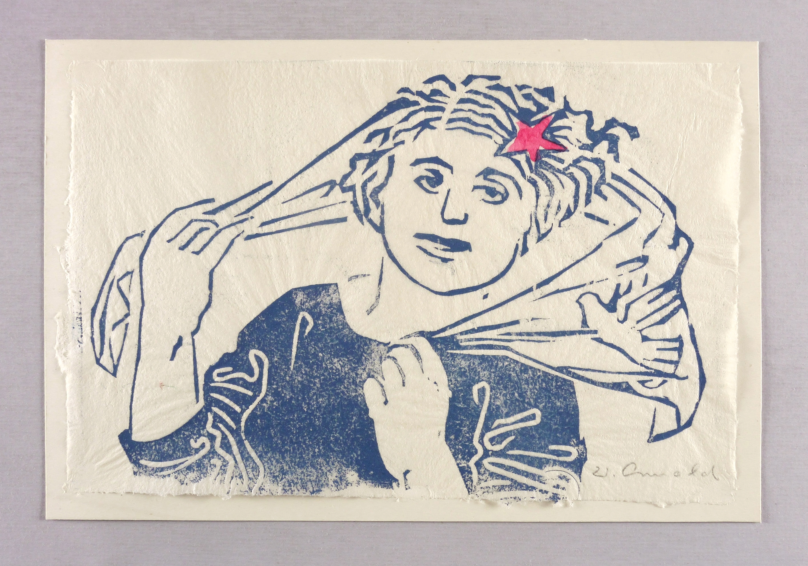 1958. Farbholzschnitt, Aquarellfarbe in Rot & Schwarzblau, auf Japan. – Originale Künstlergrafik, von Walter Arnold. – 19,0 x 27,5 cm (Darstellung / Druckbild), 19,5 x 30,0 cm (Blatt), 22 x 32 cm (Trägerkarton).