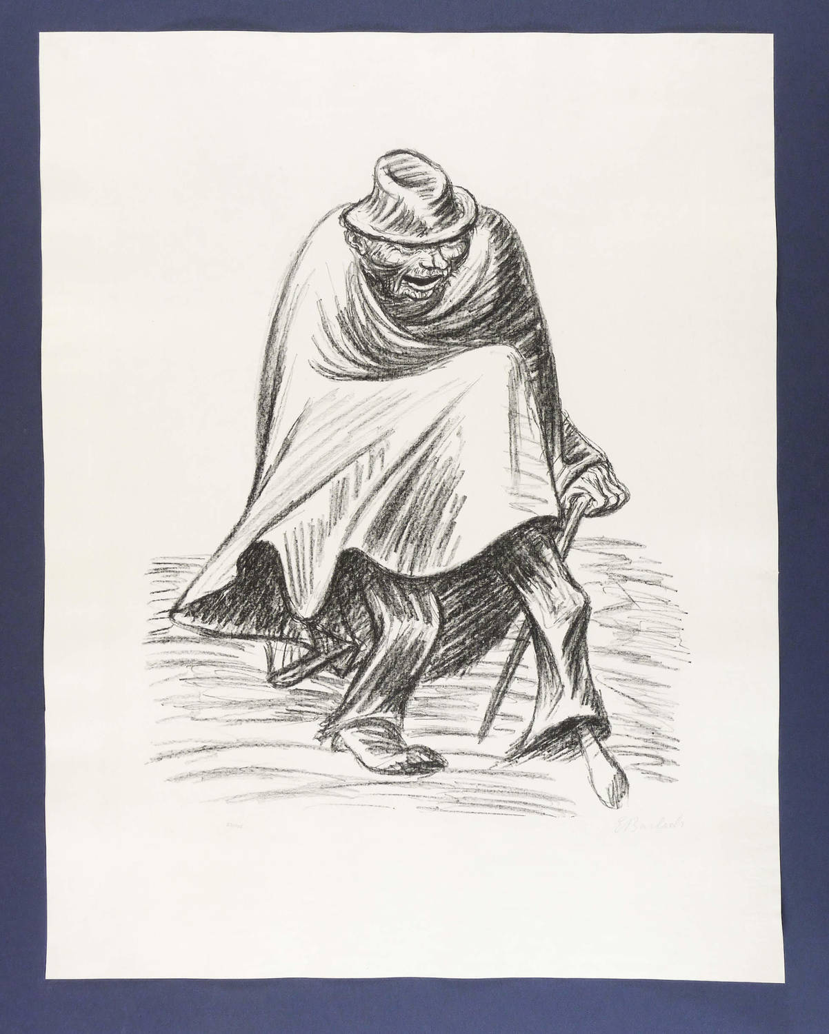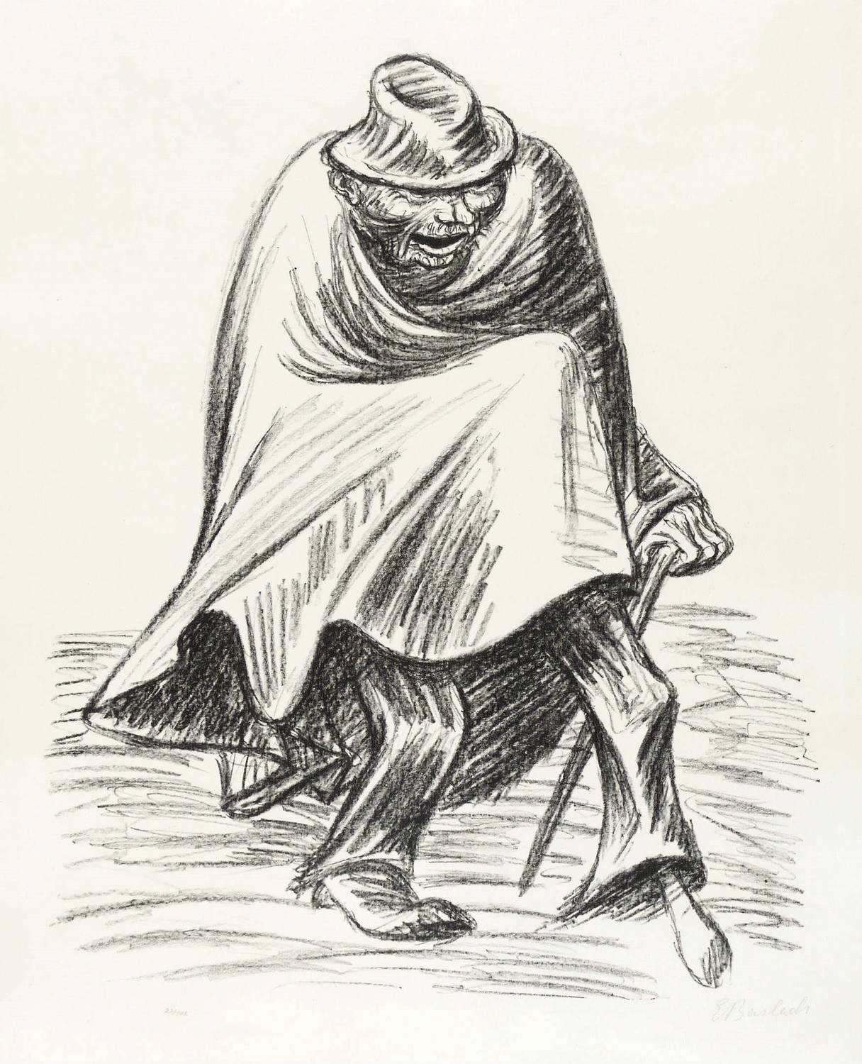 Laur 73.05. Schult 199. – Rechts unten in Bleistift signiert: ″E Barlach″. Links Auflagenbezeichnung. Wasserzeichen. – Aus dem Zyklus ″Die Ausgestoßenen″, den der Verlag von Paul Cassirer in Berlin 1922 als lose Folge herausgab. – Breitrandiges Exemplar. Blattkante rechts mit kurzem restauriertem Riss. Papier sonst schön frisch und ohne Tadel. Insgesamt guter bis sehr guter Zustand.