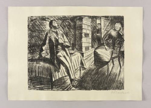 Laur 54.27 A 1. Schult 138. – Aus: Ernst Barlach, Der arme Vetter (Berlin: Paul Cassirer 1919). – Rechts unten in Bleistift signiert: ″E Barlach″. Links Auflagenbezeichnung: ″5/21″. – Blatt Nr. 22 aus dem Lithografie-Zyklus ″Der arme Vetter″ von 1919. – Handsignierter und nummerierter Druck der ersten durchnummerierten Ausgabe von 80 Exemplaren. – Dargestellte Szene: In einem Gästezimmer spricht Siebenmark mit Lena Isenbarn, während der Wirt mit einem Tablett zur Tür hineinkommt. – Originalrandiges Exemplar. Sehr guter Zustand.