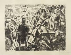 Laur 54.23 A 1. Schult 134. – Aus: Ernst Barlach, Der arme Vetter (Berlin: Paul Cassirer 1919). – Rechts unten in Bleistift signiert: ″E Barlach″. Links Auflagenbezeichnung: ″5/17″. – Blatt Nr. 18 aus dem Lithografie-Zyklus ″Der arme Vetter″ von 1919. – Handsignierter und nummerierter Druck der ersten durchnummerierten Ausgabe von 80 Exemplaren. – Dargestellte Szene: Im Wirtshaus liest ein als Frau Verkleideter aus Ivers Notizen vor. Der steht allein unter einer Lampe, neben ihm sitzen Siebenmark, Engholm und Voß. – Originalrandiges Exemplar. Sehr guter Zustand.