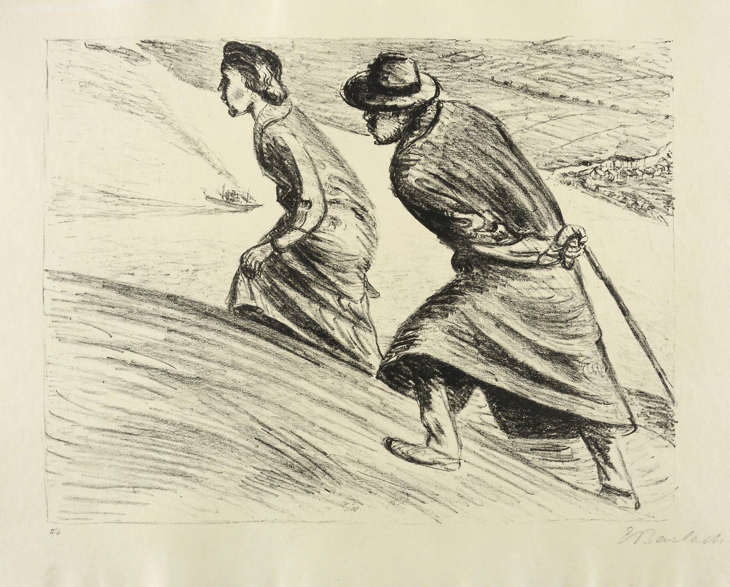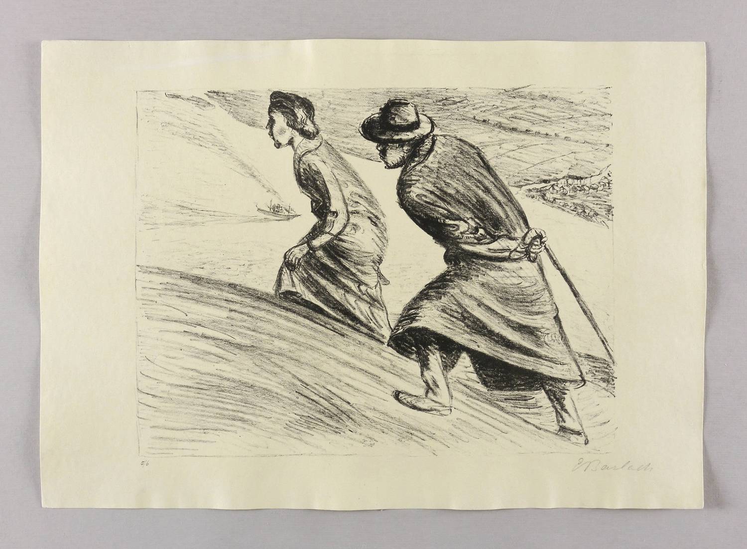 Laur 54.05 A 1. Schult 117. – Aus: Ernst Barlach, Der arme Vetter (Berlin: Paul Cassirer 1919). – Rechts unten in Bleistift signiert: ″E Barlach″. Links Auflagenbezeichnung: ″5/6″. – Blatt Nr. 1 aus dem Lithografie-Zyklus ″Der arme Vetter″ von 1919. – Handsignierter und nummerierter Druck der ersten durchnummerierten Ausgabe von 80 Exemplaren. – Dargestellte Szene: Siebenmark steigt mit seiner Verlobten Fräulein Isenbarn einen Hügel über dem Elbtal empor. – Originalrandiges Exemplar. Sehr guter Zustand.