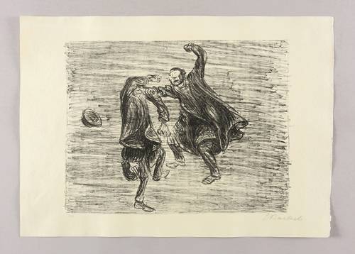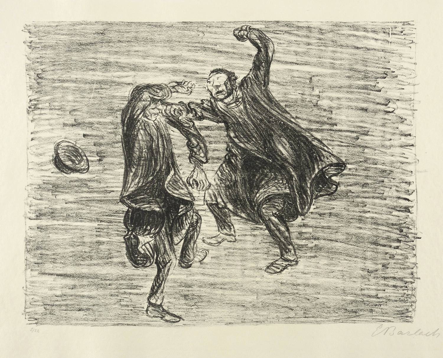 Laur 54.28 A 1. Schult 139. – Aus: Ernst Barlach, Der arme Vetter (Berlin: Paul Cassirer 1919). – Rechts unten in Bleistift signiert: ″E Barlach″. Links Auflagenbezeichnung: ″5/22″. – Blatt Nr. 23 aus dem Lithografie-Zyklus ″Der arme Vetter″ von 1919. – Handsignierter und nummerierter Druck der ersten durchnummerierten Ausgabe von 80 Exemplaren. – Dargestellte Szene: Siebenmark und Iver kämpfen miteinander. – Originalrandiges Exemplar. Sehr guter Zustand.