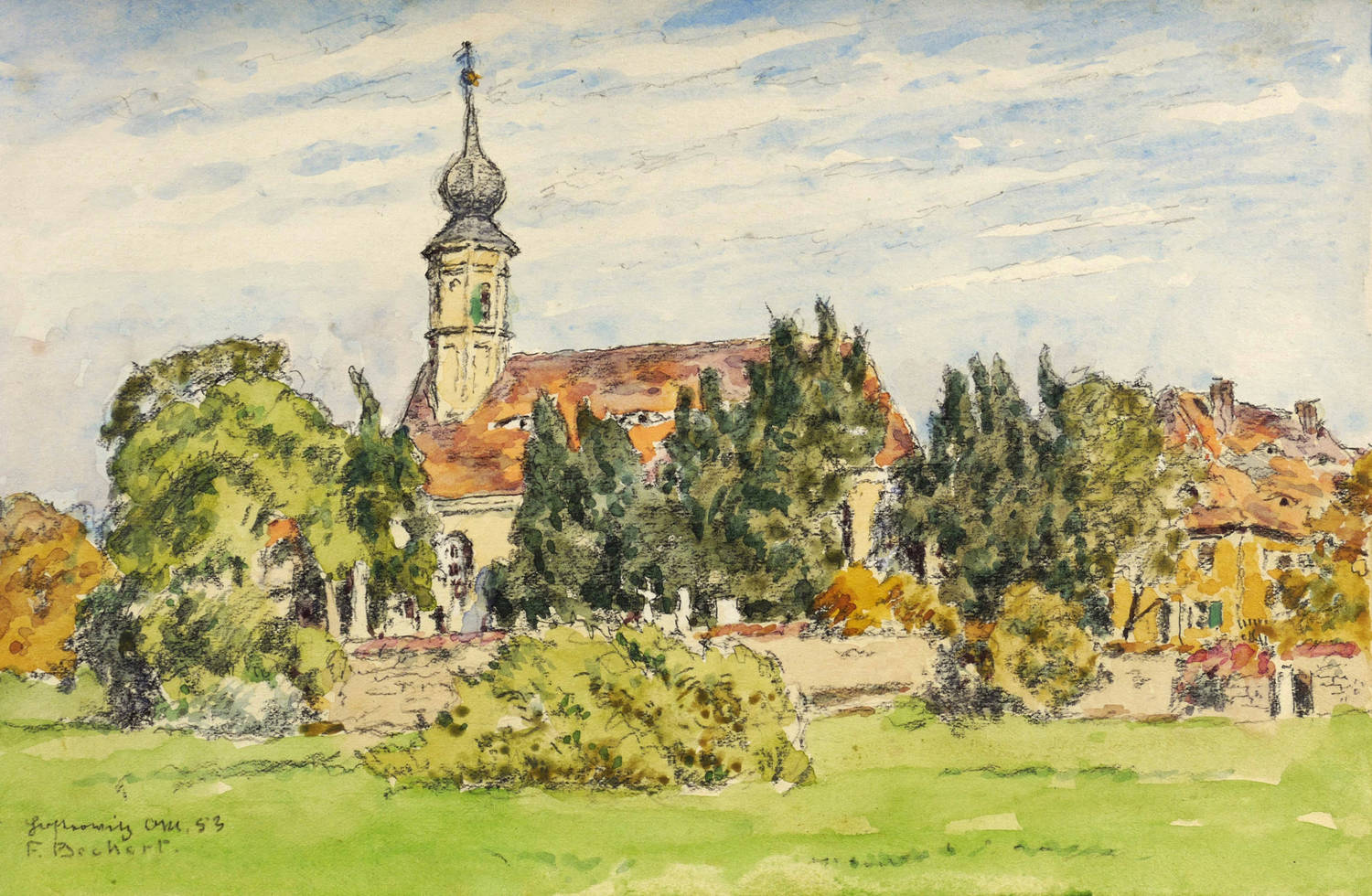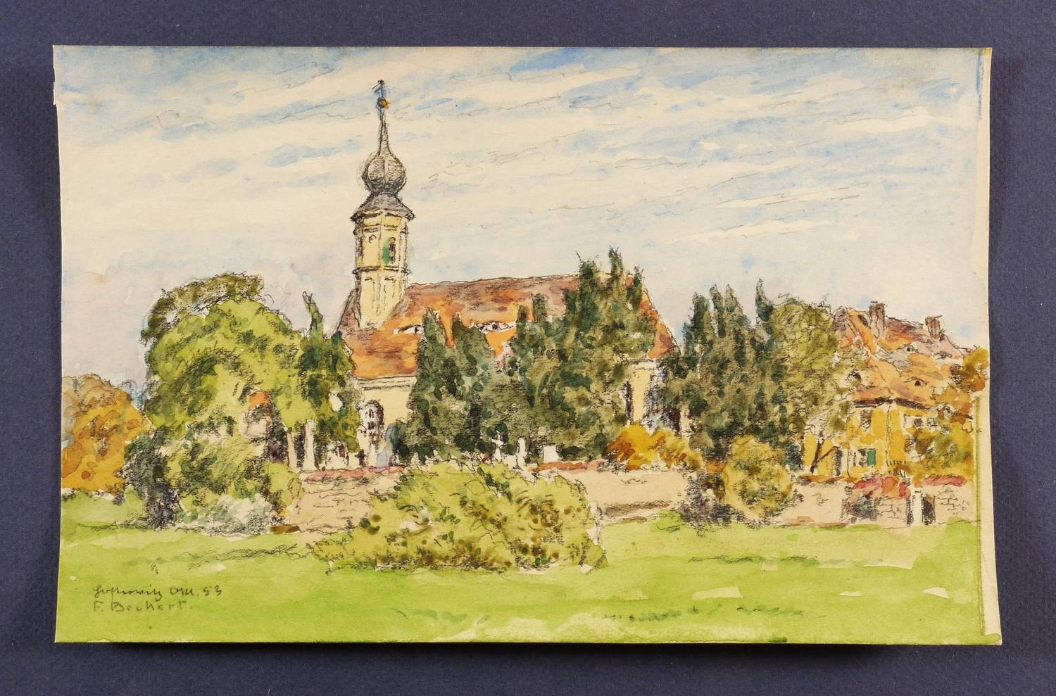 Links unten in schwarzer Kreide signiert: ″F. Beckert″. Darüber bezeichnet: ″Hosterwitz Okt. 53″. – Ansicht der Schifferkirche Maria am Wasser in Hosterwitz von den Elbwiesen bei Pillnitz aus gesehen. – Ohne Tadel. Hervorragender Zustand.