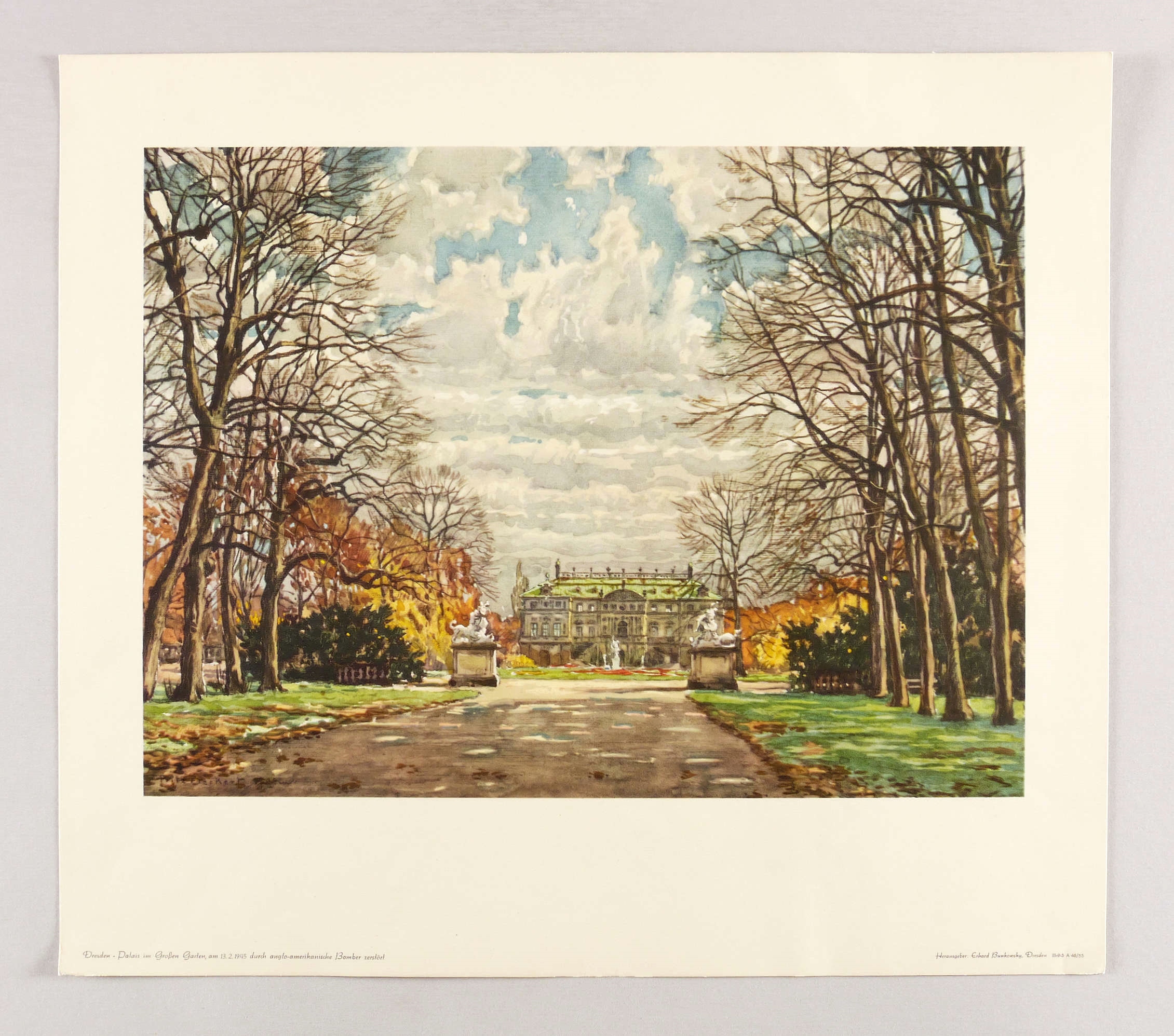 Aus: Fritz Beckert, Dresden. Kunstblätter nach Originalen von Prof. Fritz Beckert (Dresden: Selbstverlag 1955). – In der Druckform links unten signiert: ″Fritz Beckert Dresden″. In der linken unteren Blattecke typografisch bezeichnet: ″Dresden. Palais im Großen Garten. am 13. 2. 1945 durch anglo-amerikanische Bomber zerstört″. – Im Rand minimal knickspurig . Sonst gut erhalten.