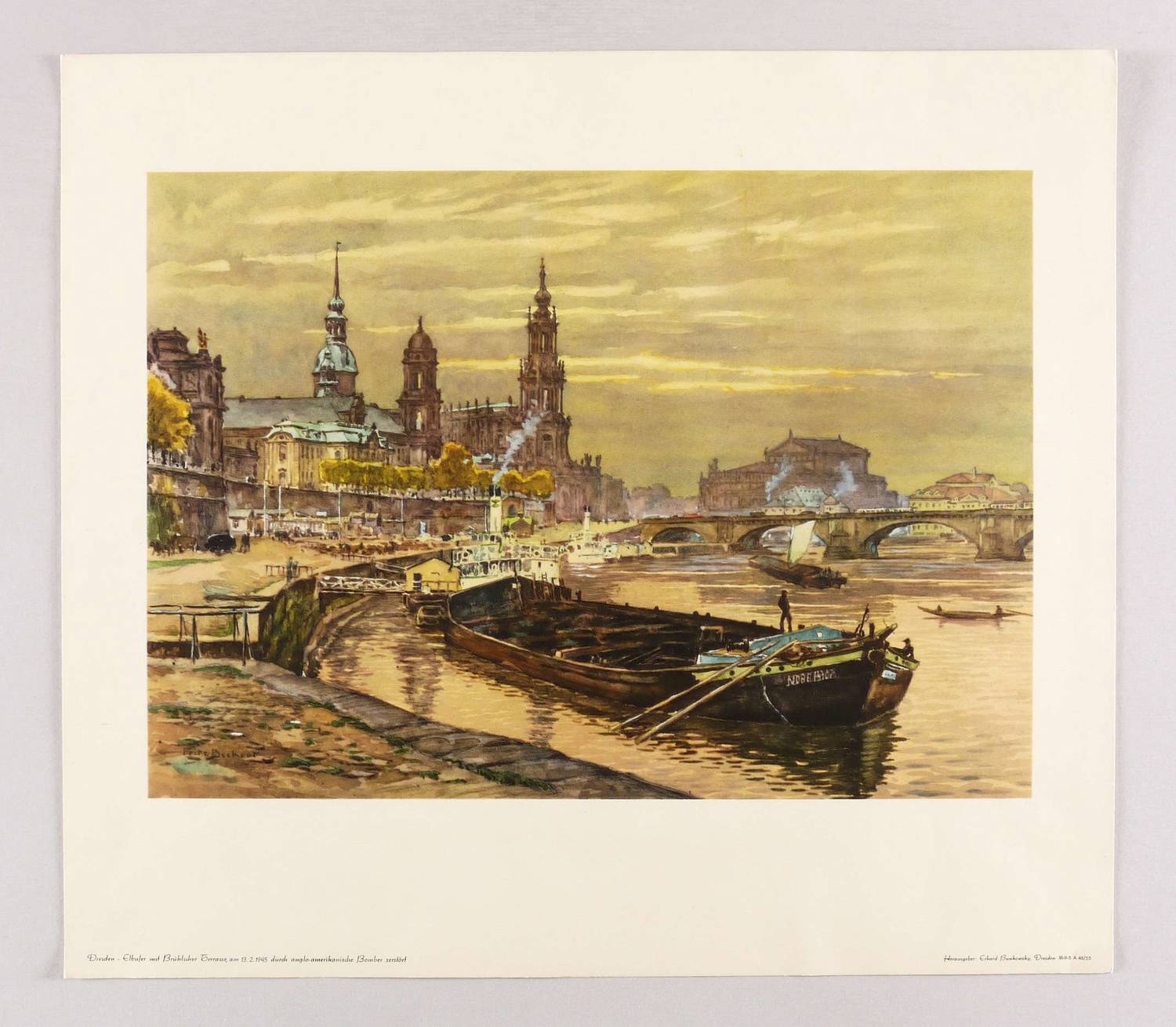 Aus: Fritz Beckert, Dresden. Kunstblätter nach Originalen von Prof. Fritz Beckert (Dresden: Selbstverlag 1955). – In der Druckform links unten signiert: ″Fritz Beckert″. In der linken unteren Blattecke typografisch bezeichnet: ″Dresden - Elbufer mit Brühlscher Terrasse, am 3. 2. 1945 durch anglo-amerikanische Bomber zerstört″. – Im Rand kaum merklich knickspurig . Sonst gut erhalten.