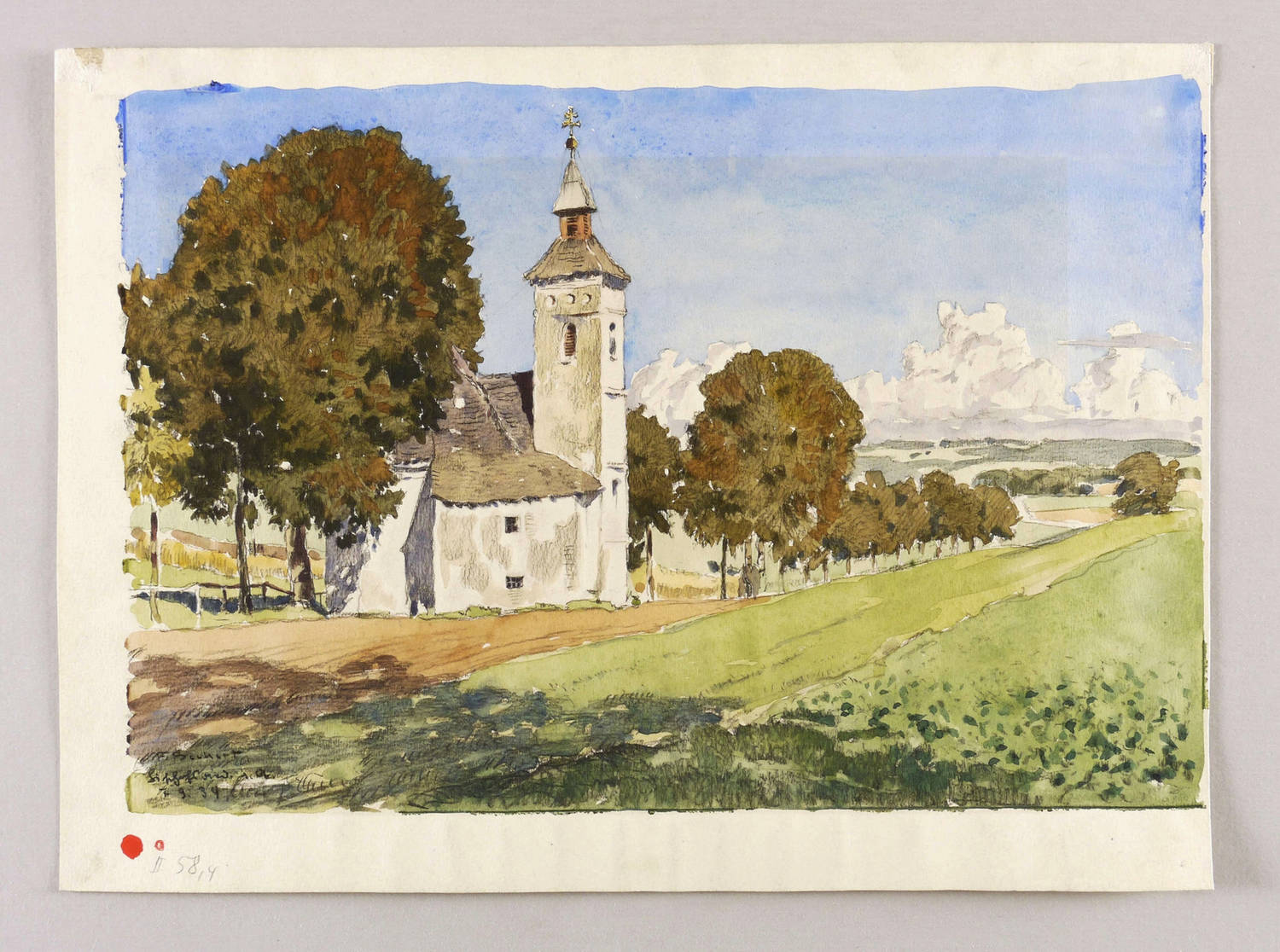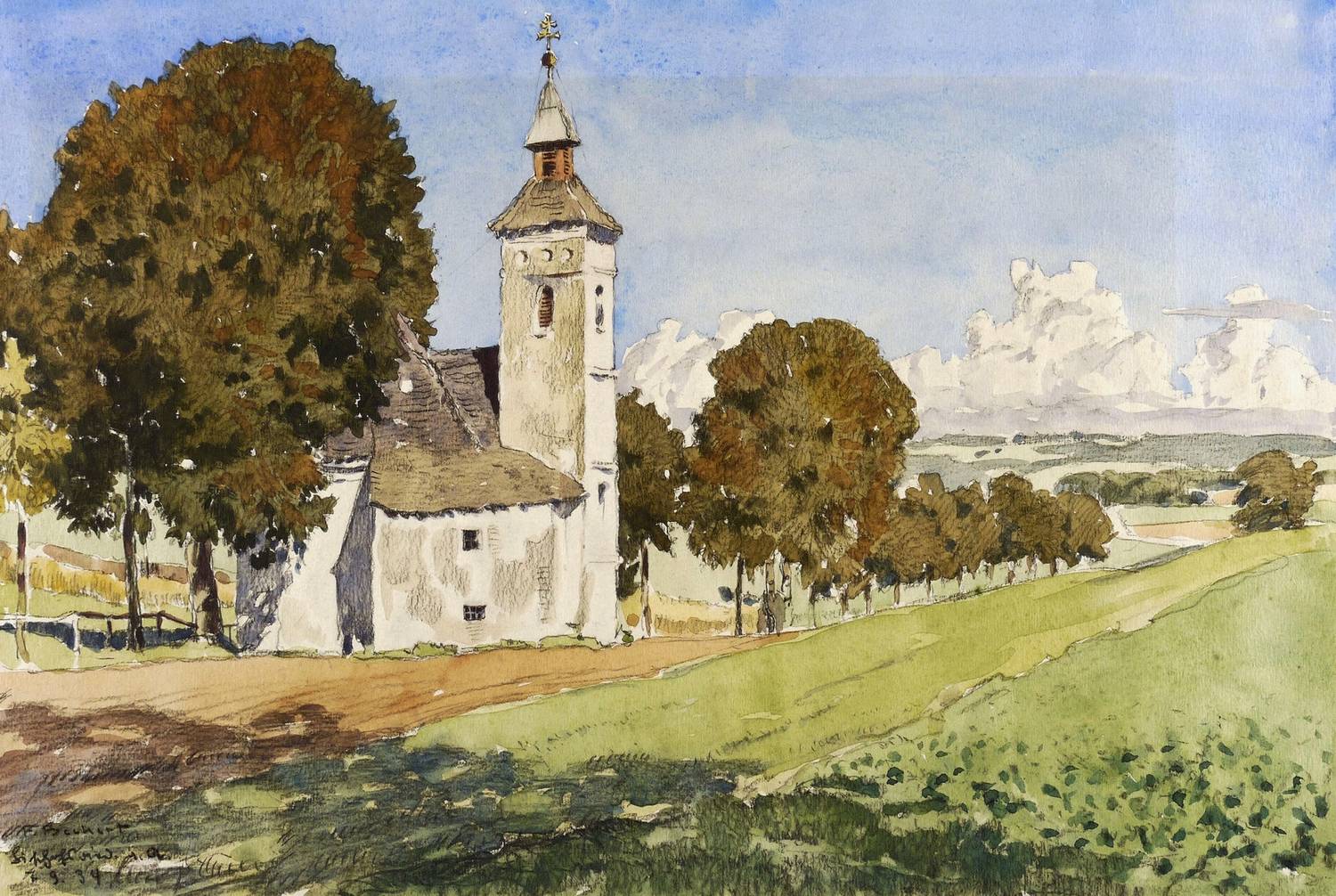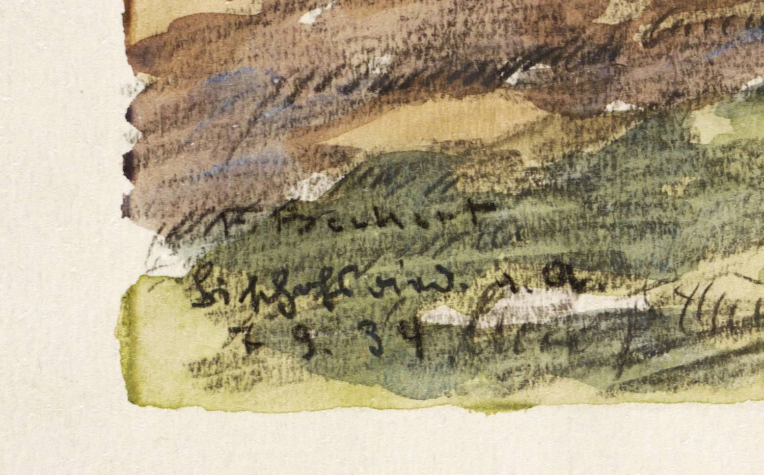 Links unten in schwarzer Kreide signiert: ″F. Beckert″. Darunter bezeichnet und datiert: ″Bischofsried / 1934″. – Unscheinbarer Lichtrand. Schönes Kolorit. Rückseitig in den oberen Blattecken Montagereste. Insgesamt guter Zustand.