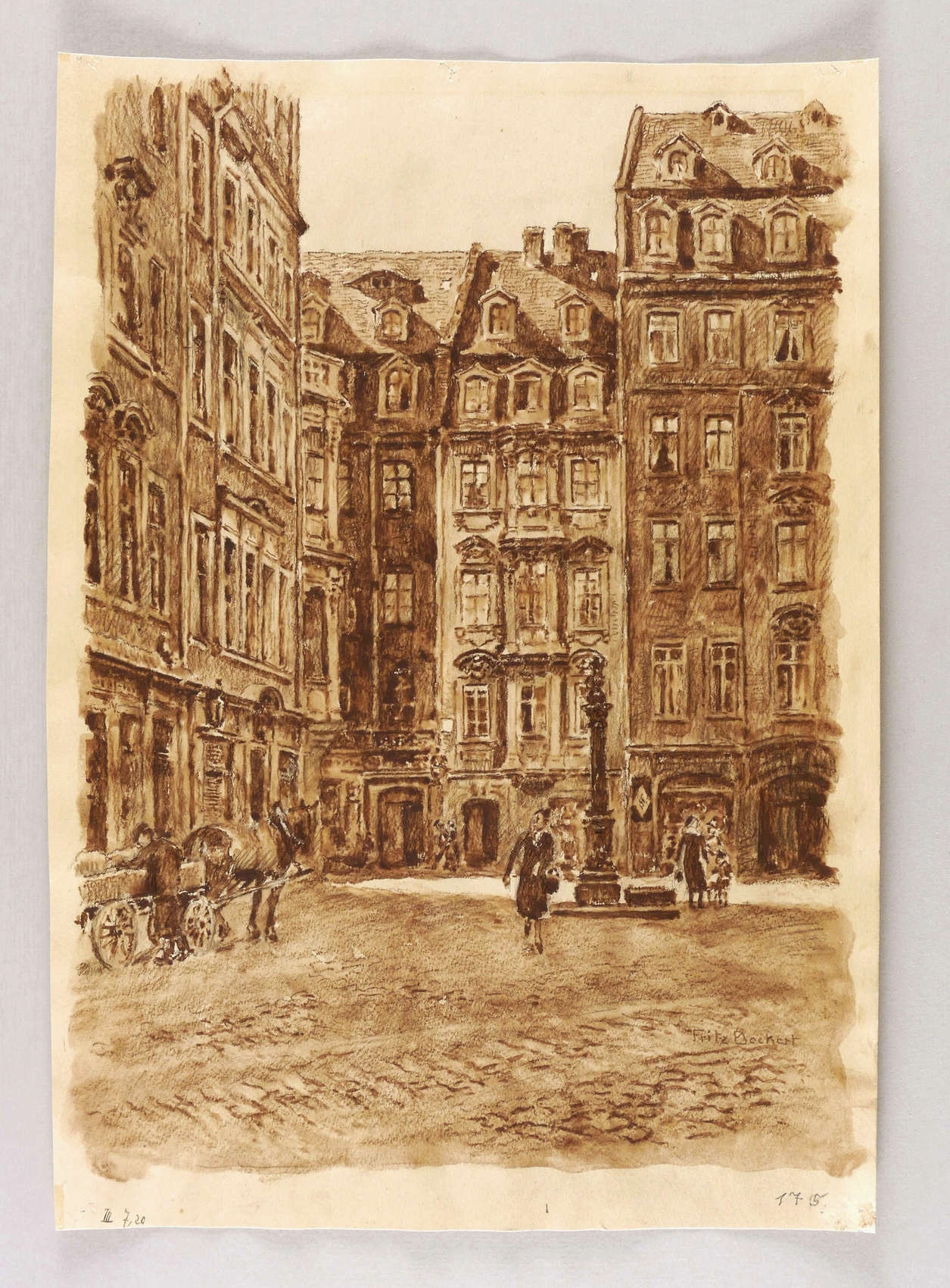 Rechts unten in Bleistift signiert: ″Fritz Beckert″. Links unten in brauner Feder Werk-Nr.: ″III 7,20″. – In den Blattecken originale Reißzwecklöchlein. Wenige kaum merkliche Montagespuren. Insgesamt guter bis sehr guter Zustand.