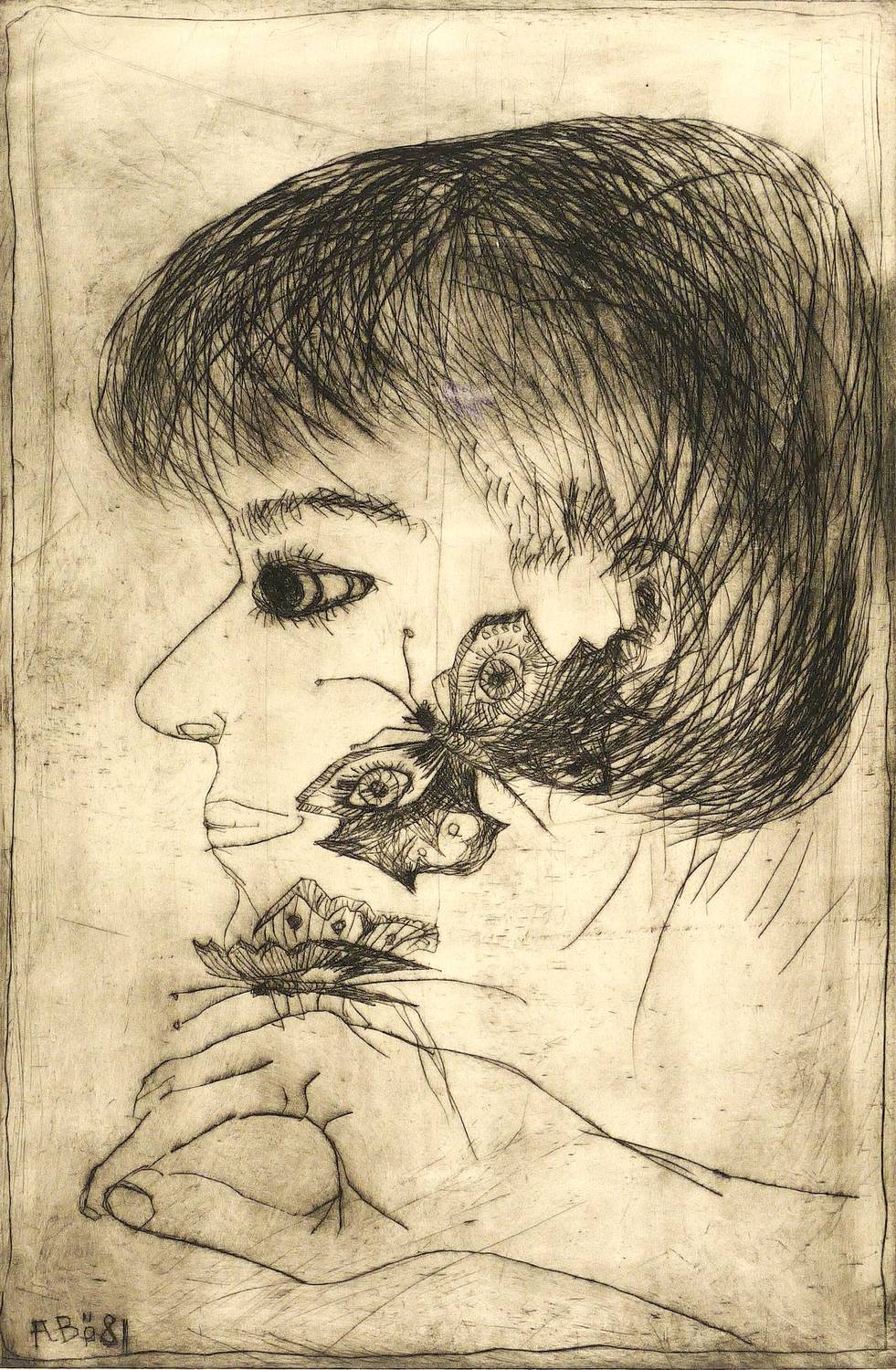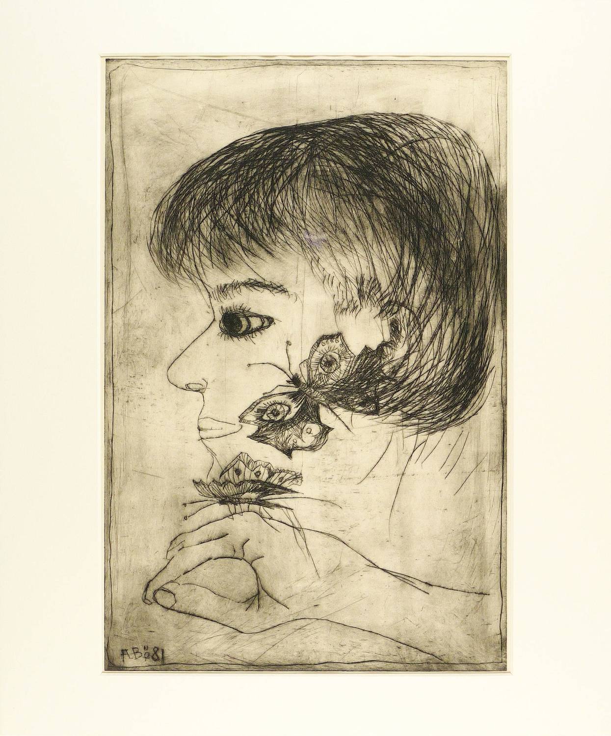 1981. Radierung / Kaltnadelradierung, mit Plattenton, in Schwarzbraun, auf Bütten. – Originale Künstlergrafik, von Agathe Böttcher. – Probedruck. – 49,5 x 32,7 cm (Darstellung / Platte), 51 x 38 cm (Blatt), 60 x 50 cm (Passepartout).
