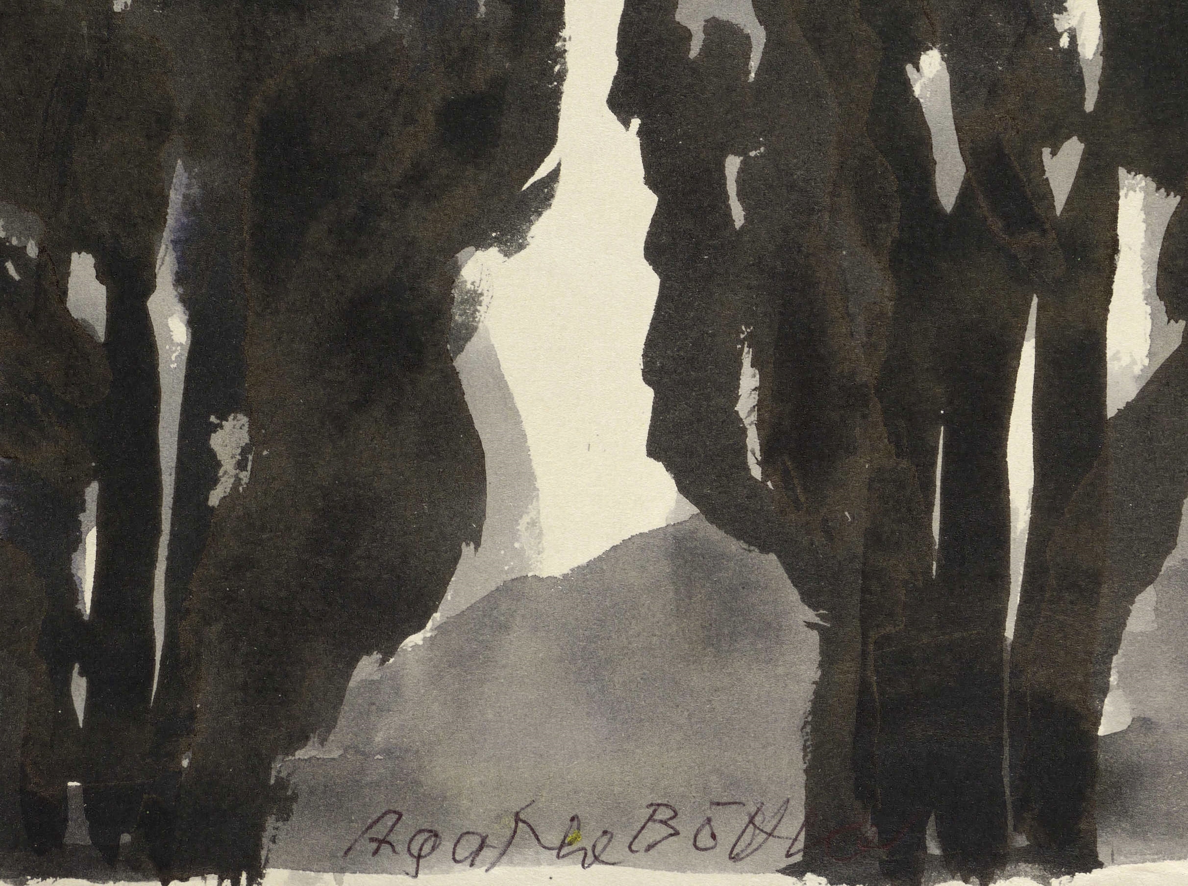 1990-2000. Zeichnung / Pinselzeichnung, in schwarzer Tusche, auf hellbeigem Achatbütten. – Originale Künstlergrafik, von Agathe Böttcher. – Unikat. – 47,0 x 33,0 cm (Darstellung / Blatt).