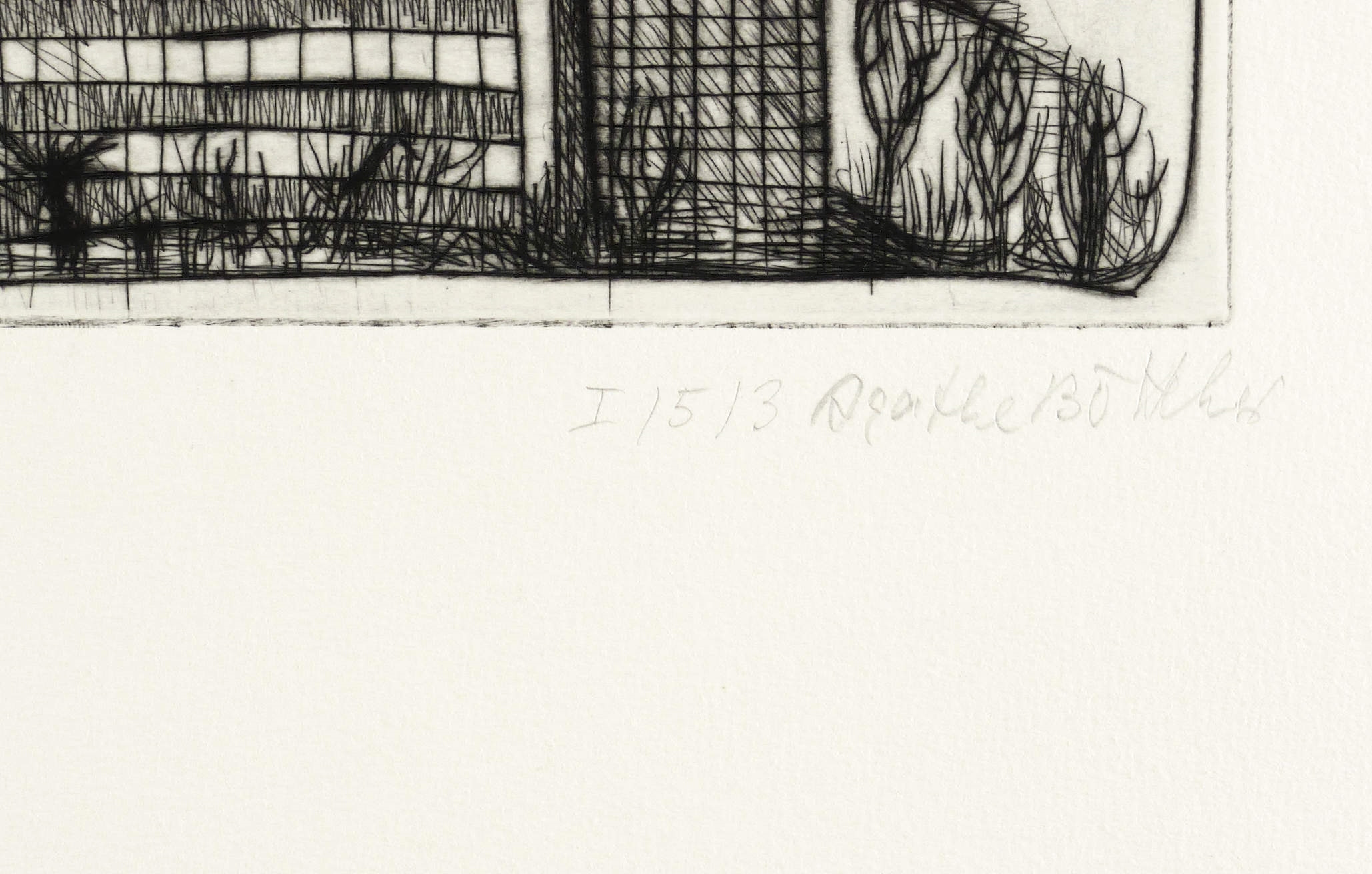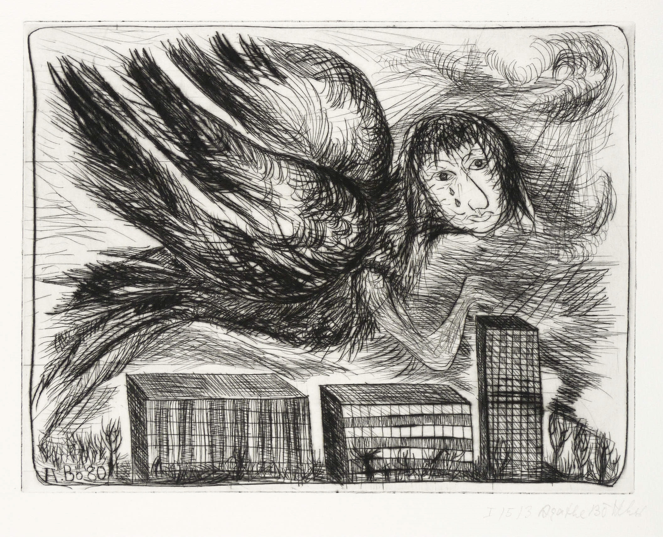 1980. Radierung / Kaltnadel, mit leichtem Plattenton, in Schwarz, auf Hahnemühle-Bütten. – Originale Künstlergrafik, von Agathe Böttcher. – Auflage Exemplar Nr. 3/5. – 24,9 x 32,3 cm (Darstellung / Platte), 54 x 40 cm (Blatt).