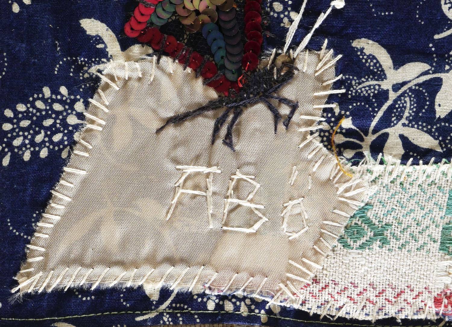 Um 1980. Textilcollage, diverse Stoffe, Pailletten, Samt & Zwirn, auf blau gemustertem Leinen. – Von Agathe Böttcher. – Unikat. – 41,5 x 32,0 cm (Darstellung).