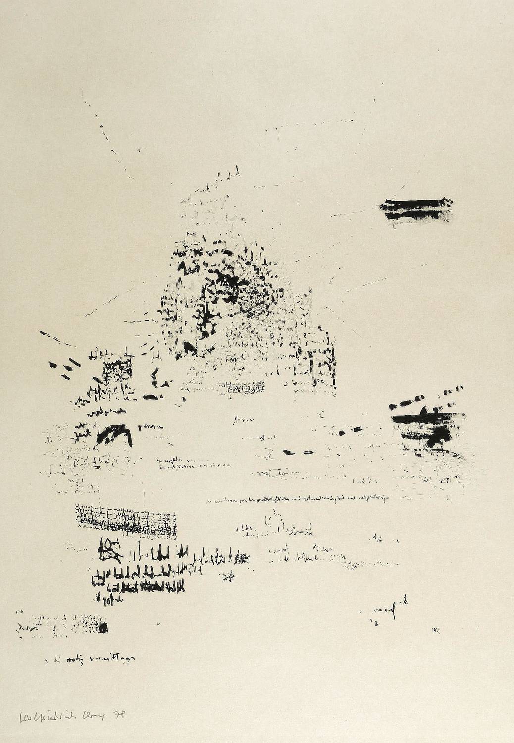 1978. Offsetlithografie / Feder-, Pinsel- & Kreidelithografie, in Schwarz, auf hellchamois Velin. – Originale Künstlergrafik, von Carlfriedrich Claus. – 37,0 x 30,3 cm (Darstellung / Stein), 49 x 35 cm (Blatt).