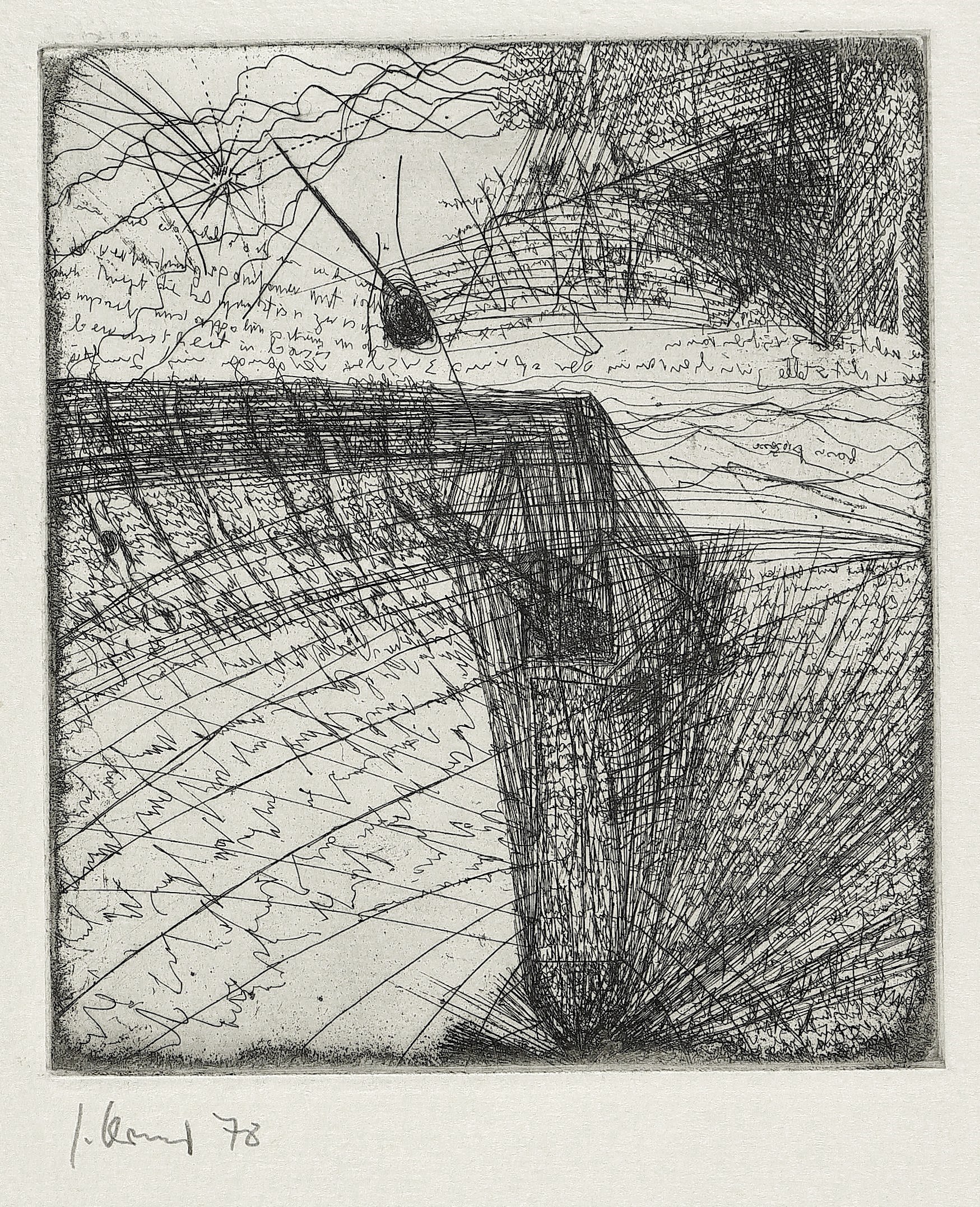 1978. Radierung / Strichätzung, in Schwarz, auf hellchamois Velin. – Originale Künstlergrafik, von Carlfriedrich Claus. – 15,0 x 12,7 cm (Darstellung / Platte), 48 x 36 cm (Blatt).