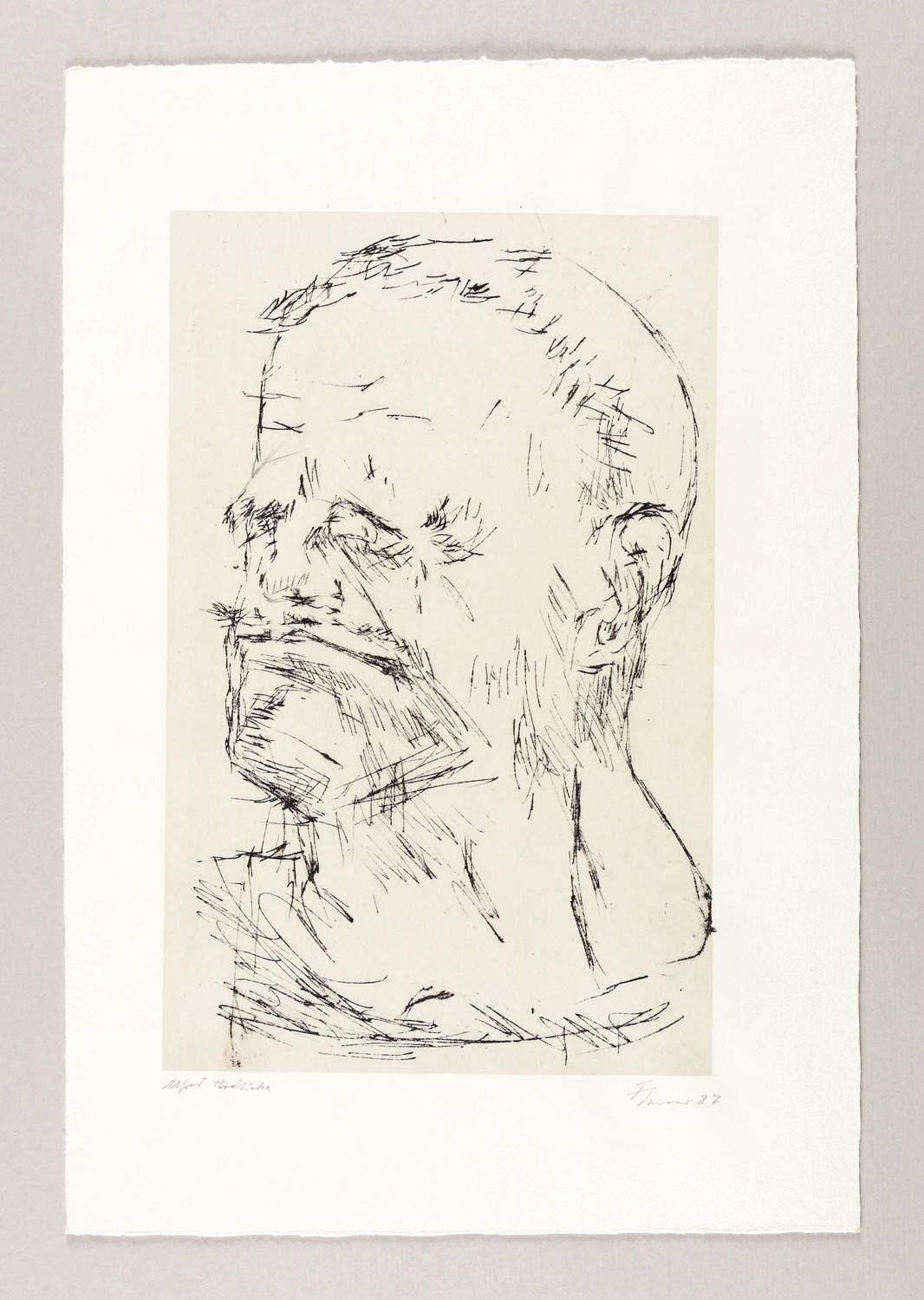 1987. Lithografie / Federlithografie, in Schwarz, über hellgrauer Tonplatte, auf weißem Velin. – Originale Künstlergrafik, von Fritz Cremer. – 27,8 x 17,3 cm (Darstellung / Druckbild), 28,7 x 18,2 cm (Tonplatte), 39 x 27 cm (Blatt).