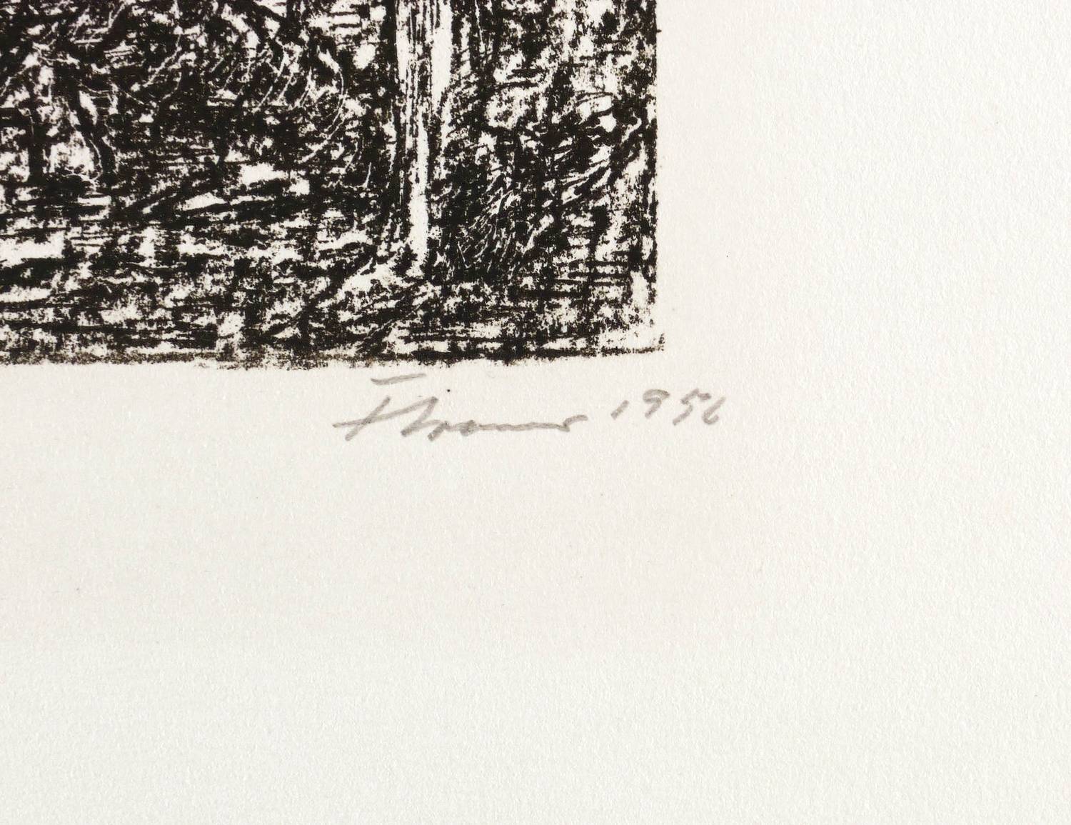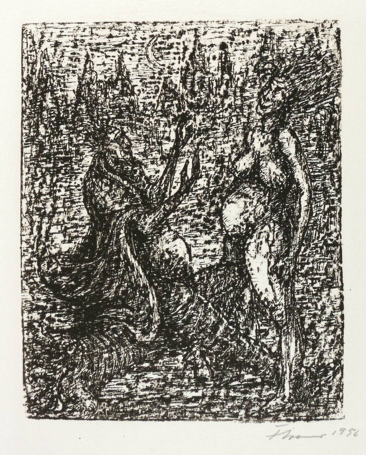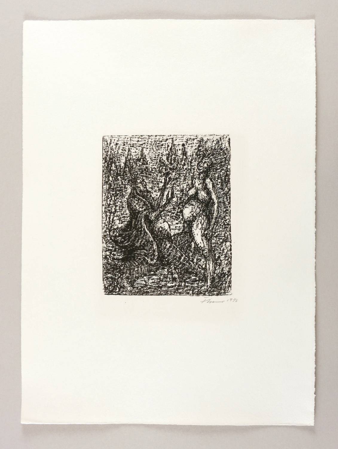 1956. Lithografie / Kreide- & Federlithografie, in Schwarz, auf leichtem hellchamois Velin. – Originale Künstlergrafik, von Fritz Cremer. – Auflage 50 Exemplare. – 17,5 x 14,1 cm (Darstellung / Druckbild), 44 x 32 cm (Blatt).