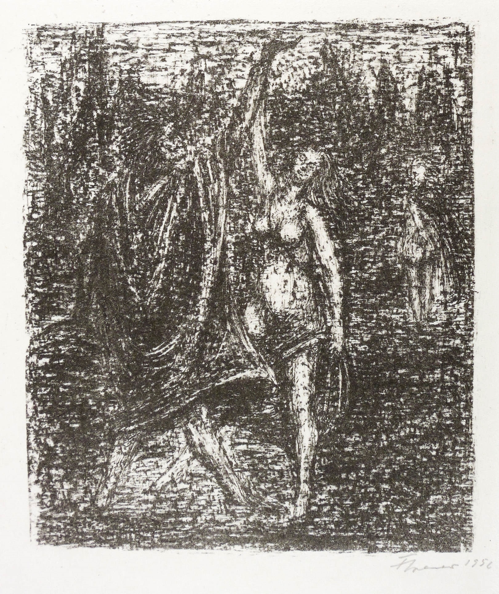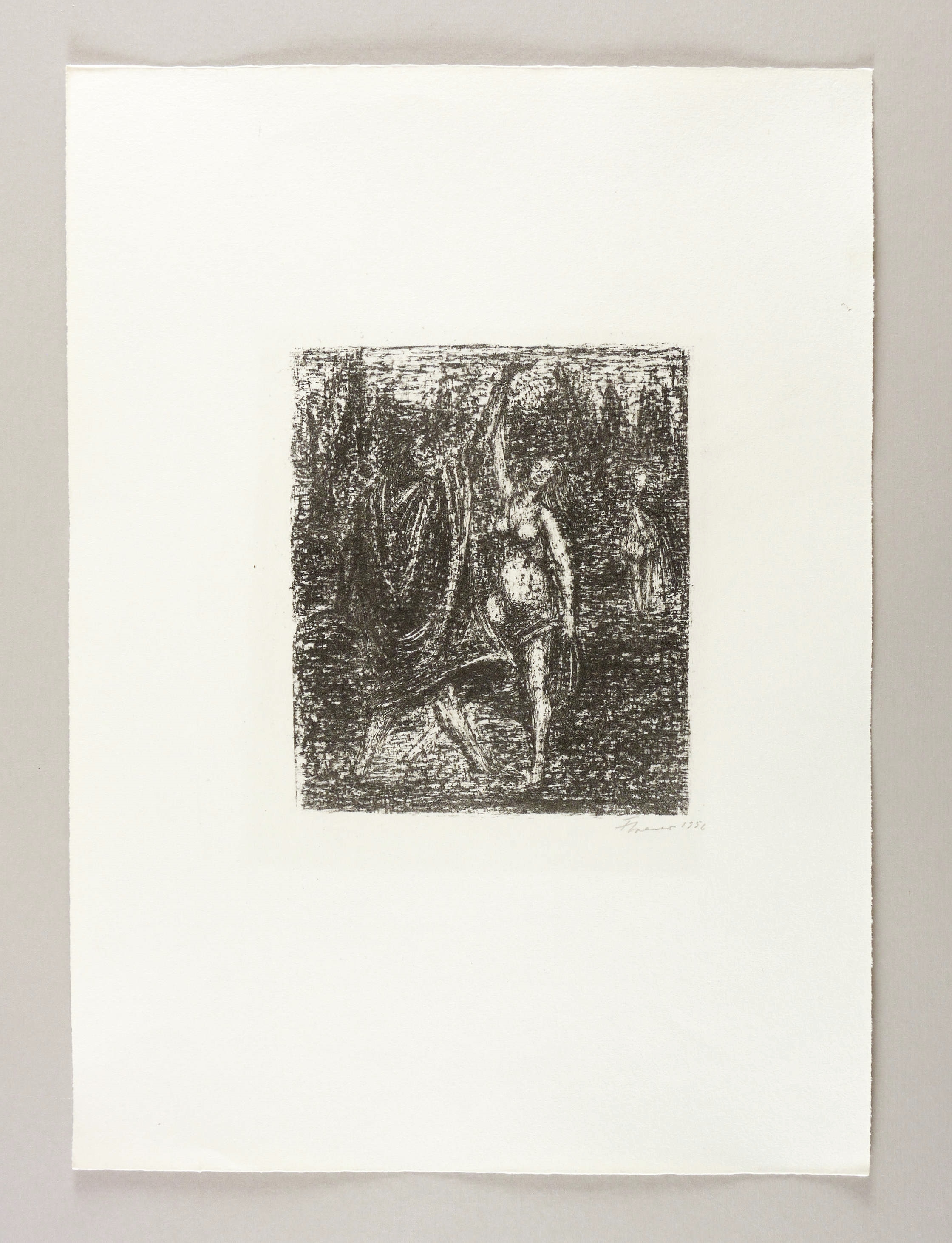 1956. Lithografie / Pinsel-, Kreide- & Federlithografie, in Schwarz, auf leichtem hellchamois Velin. – Originale Künstlergrafik, von Fritz Cremer. – Auflage 50 Exemplare. – 18,9 x 15,8 cm (Darstellung / Druckbild), 45 x 32 cm (Blatt).