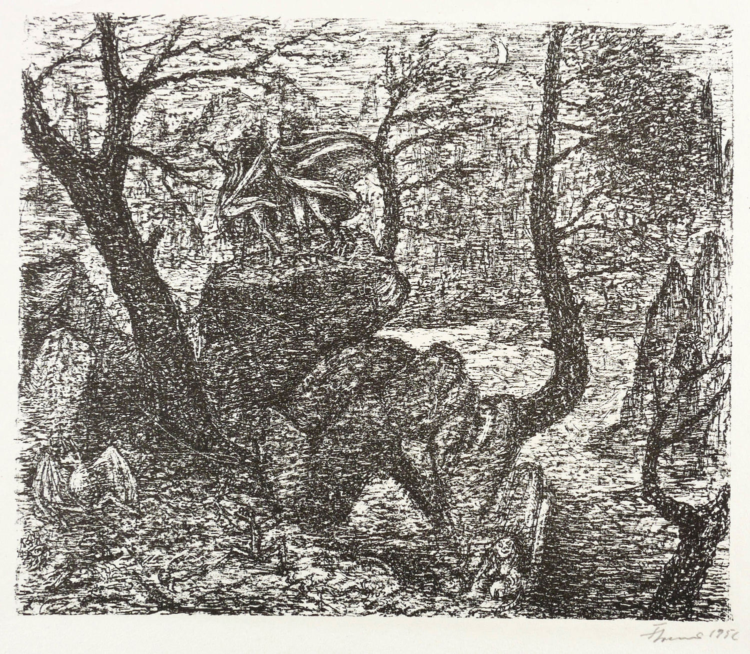 1956. Lithografie / Pinsel-, Kreide- & Federlithografie, in Schwarz, auf leichtem hellchamois Velin. – Originale Künstlergrafik, von Fritz Cremer. – Auflage 50 Exemplare. – 21,8 x 25,5 cm (Darstellung / Druckbild), 33 x 45 cm (Blatt).