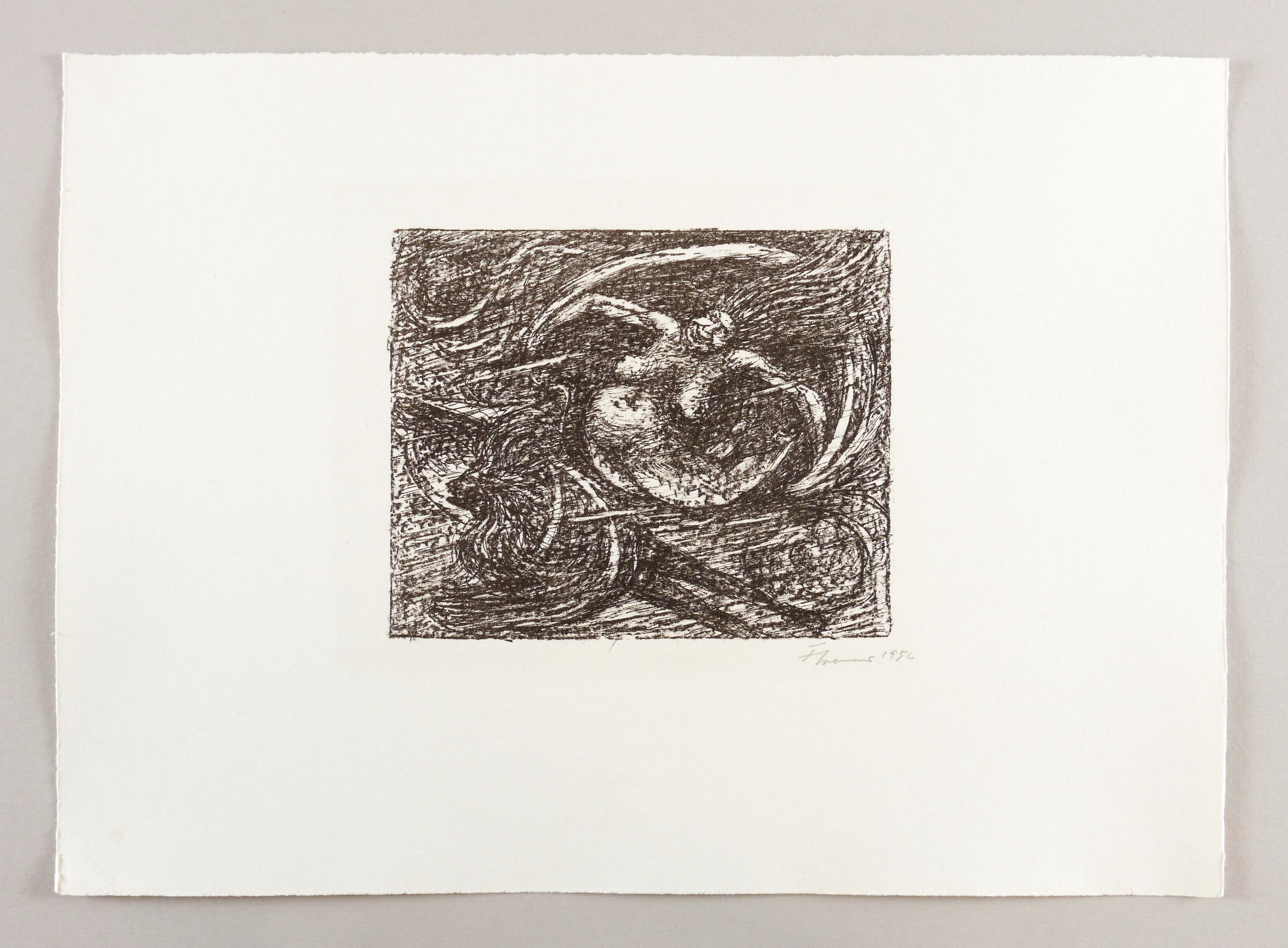1956. Lithografie / Kreide- & Federlithografie, in Schwarz, auf leichtem hellchamois Velin. – Originale Künstlergrafik, von Fritz Cremer. – Auflage 50 Exemplare. – 15,7 x 19,0 cm (Darstellung / Druckbild), 32 x 45 cm (Blatt).