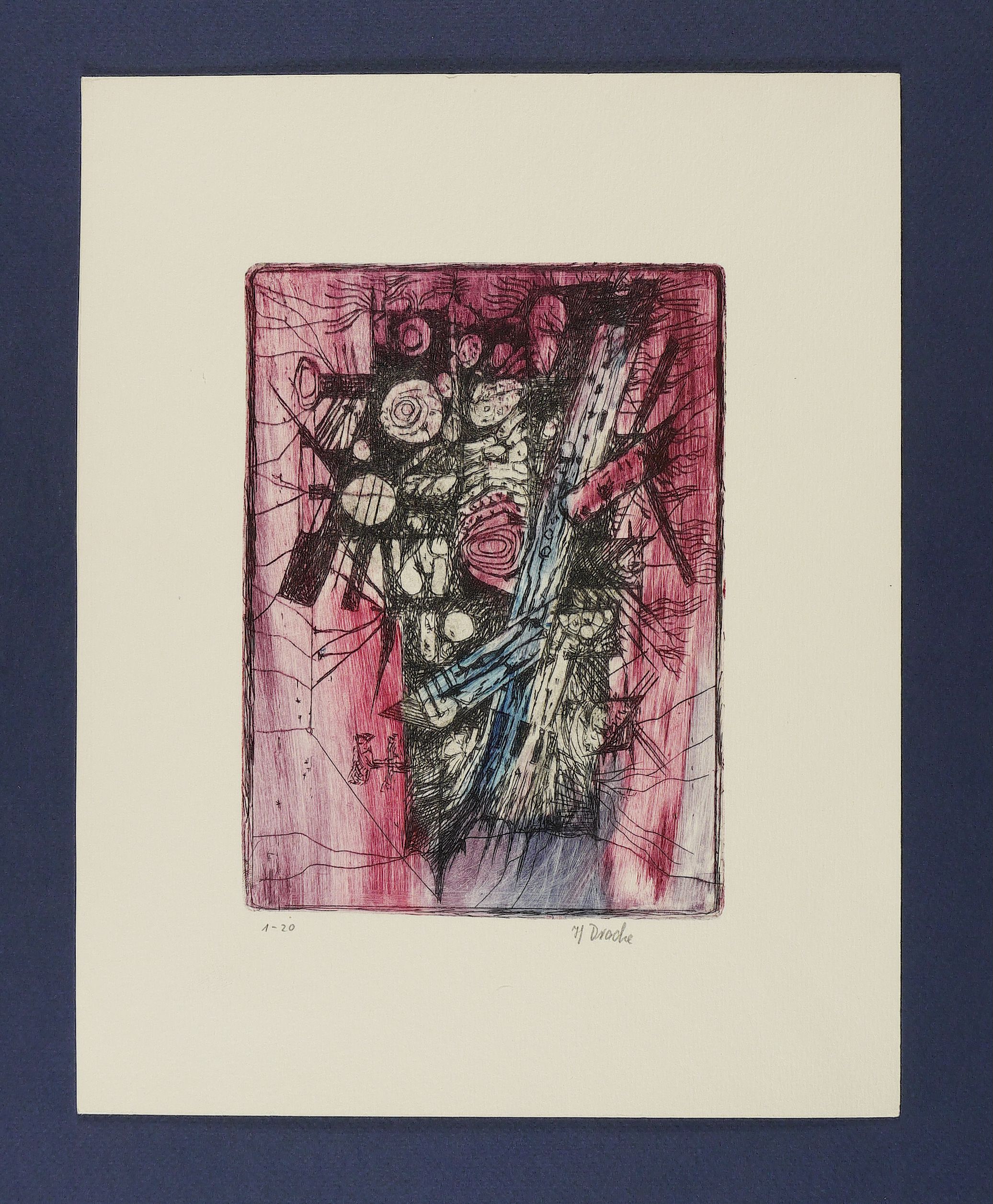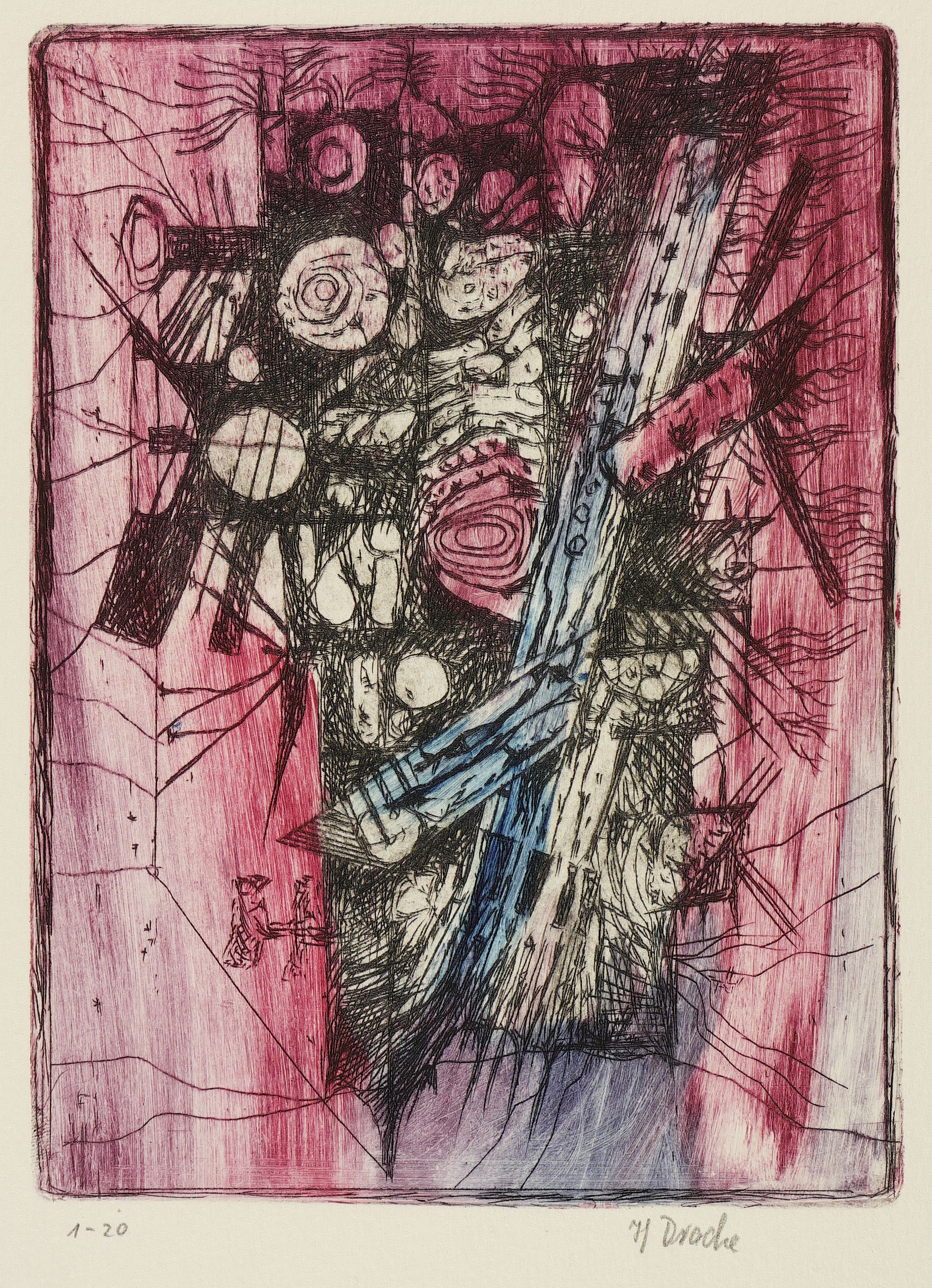 Um 1985. Farbradierung / Strichätzung & Kaltnadel, in drei Farben. – Originale Künstlergrafik, von Heinz Drache. – Auflage 20 Exemplare. – 19,0 x 14,0 cm (Darstellung / Platte), 30 x 24 cm (Blatt).