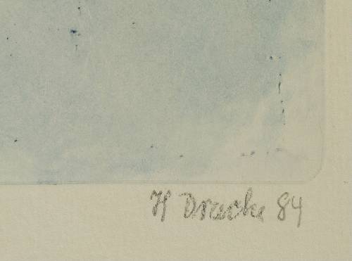 1984. Farbradierung / Strichätzung & Kaltnadel, in 3 Farben, auf chamois Velin. – Originale Künstlergrafik, von Heinz Drache. – Auflage 20 Exemplare. – 20,5 x 14,7 cm (Darstellung / Platte), 30 x 24 cm (Blatt).
