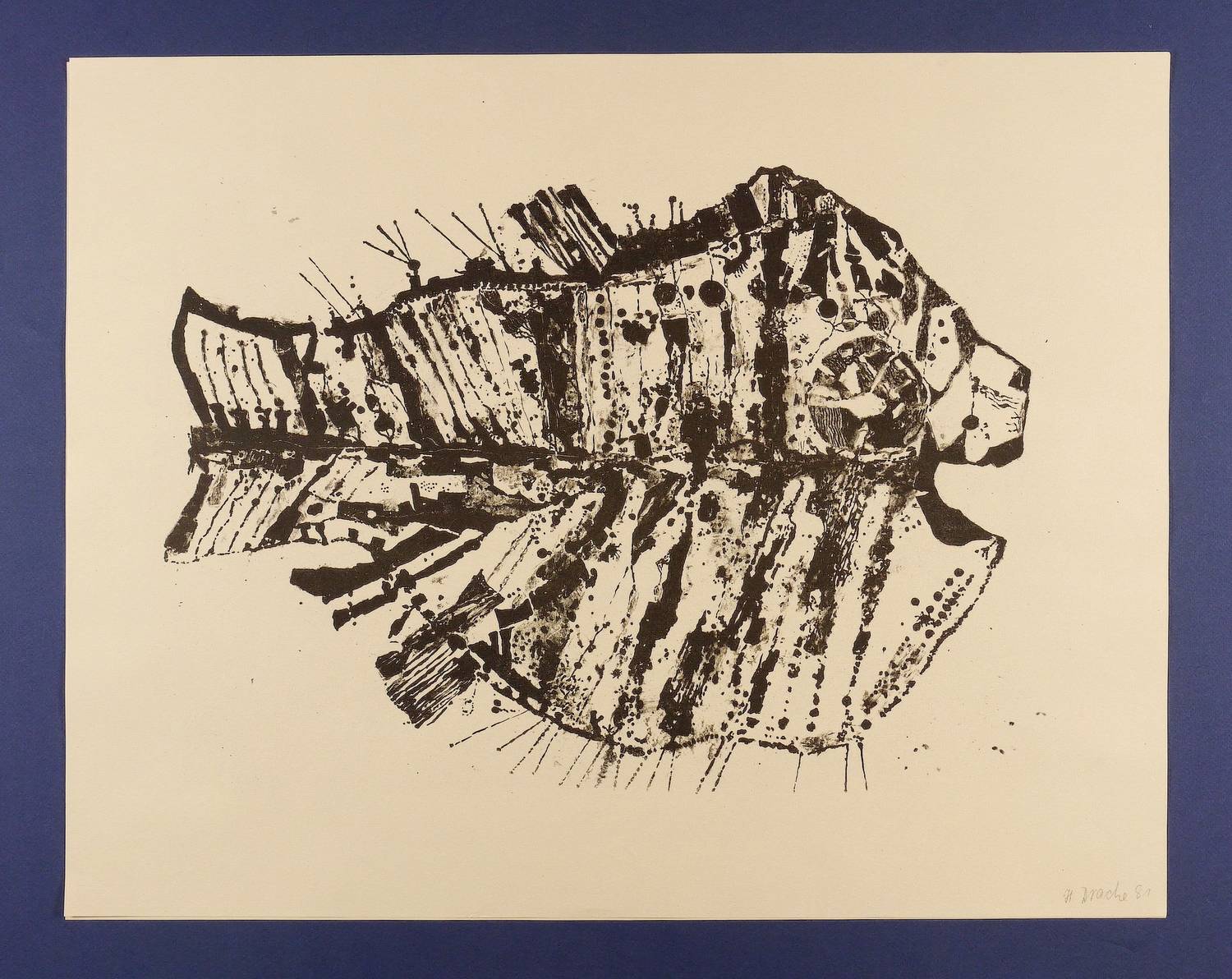 1981. Lithografie / Pinsellithografie, in Schwarz, auf braungrau getöntem Maschinenbütten. – Originale Künstlergrafik, von Heinz Drache. – 35,0 x 50,0 cm (Darstellung), 49,5 x 63,0 cm (Blatt).