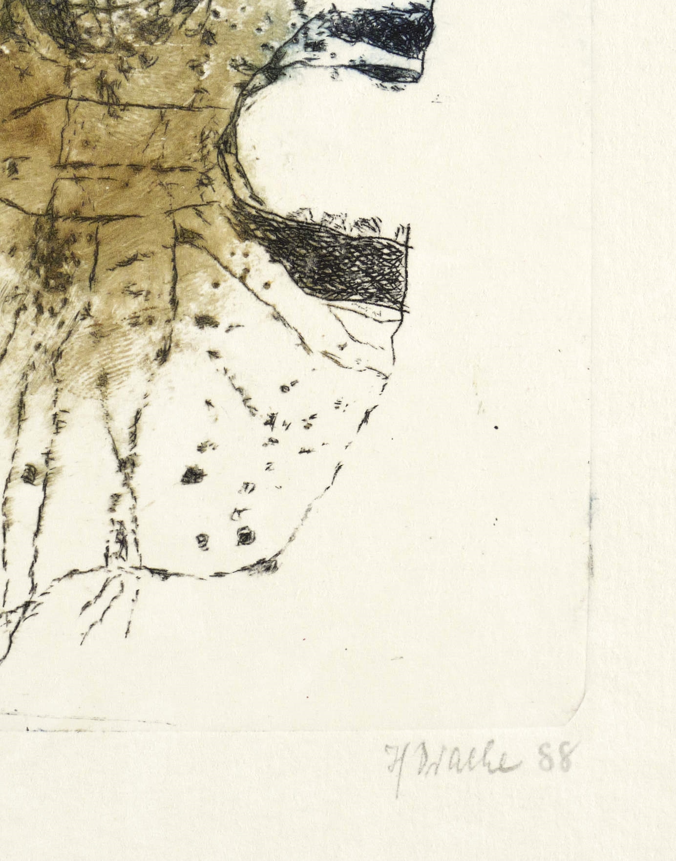 1988. Farbradierung / Strichätzung & Kaltnadel, in 3 Farben, auf hellgelbem Velinkarton. – Originale Künstlergrafik, von Heinz Drache. – Auflage 20 Exemplare. – 13,9 x 18,7 cm (Darstellung / Platte), 23,5 x 28,5 cm (Blatt).