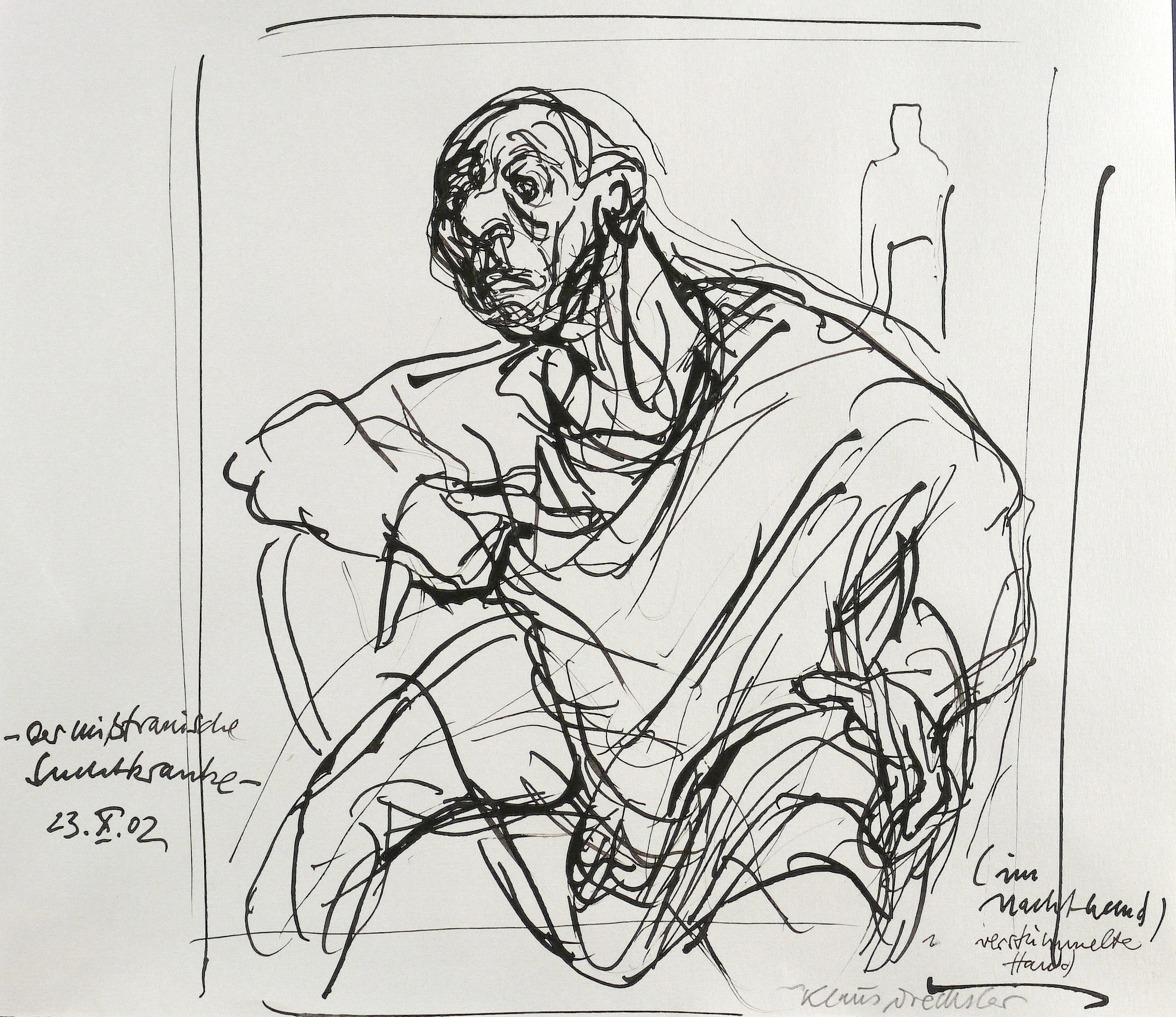 2002. Zeichnung / Federzeichnung, in schwarzer Tusche, auf hellgrauem Maschinenbütten. – Originale Künstlergrafik, von Klaus Drechsler. – Unikat. – 32,7 x 37,7 cm (Darstellung / Blatt).