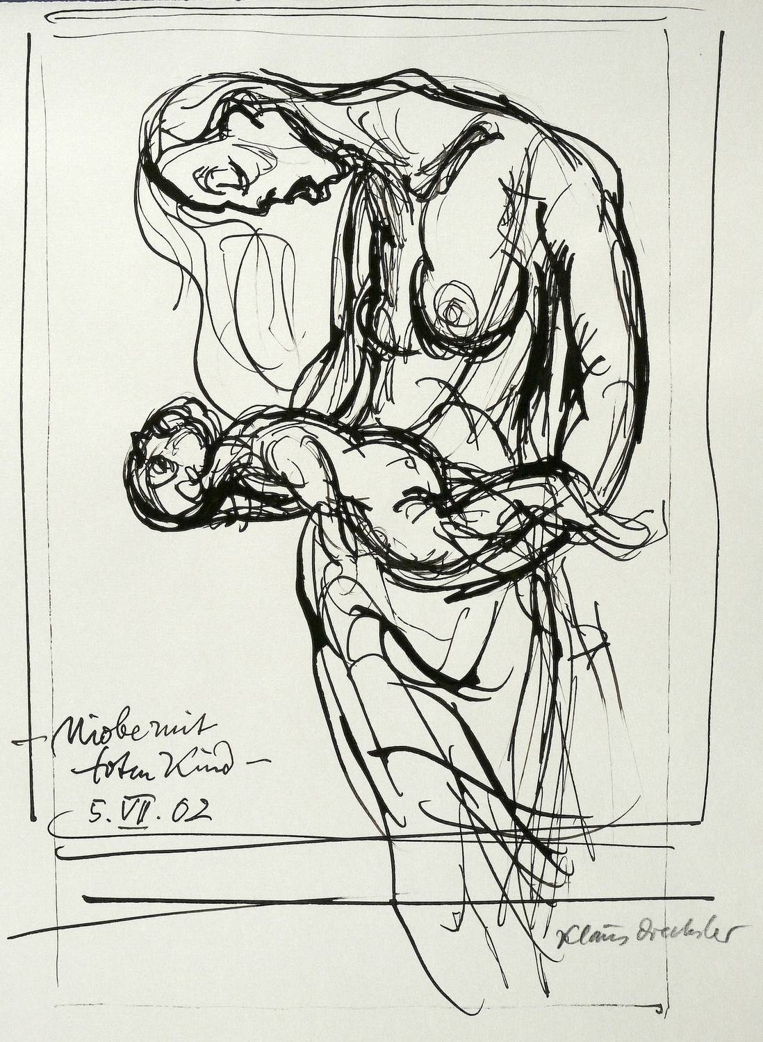 2002. Zeichnung / Federzeichnung, in schwarzer Tusche, auf hellgrauem Maschinenbütten. – Originale Künstlergrafik, von Klaus Drechsler. – Unikat. – 41,0 x 33,5 cm (Darstellung / Blatt).