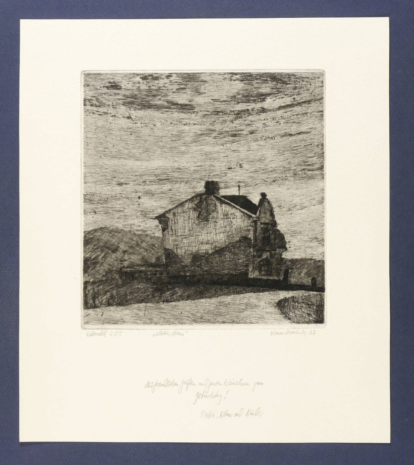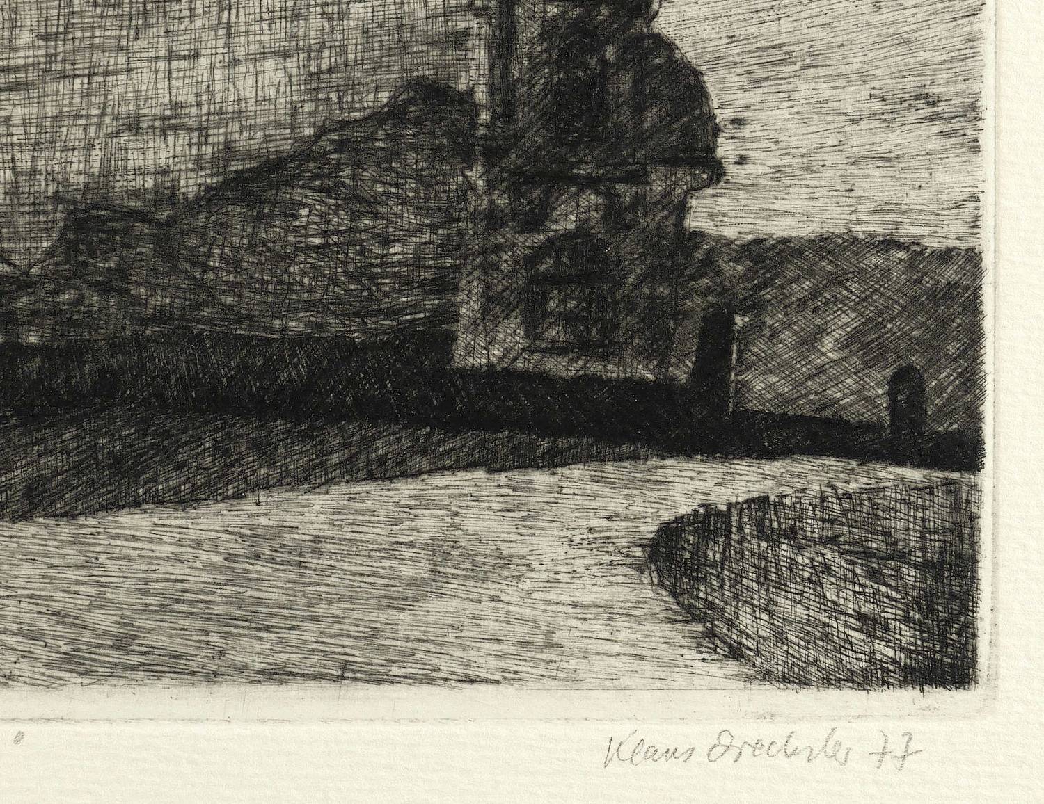 1977. Radierung / Kaltnadel, in Schwarz, auf hartem hellgelbem Maschinenpapier. – Originale Künstlergrafik, von Klaus Drechsler. – Auflage Exemplar Nr. 2/25. – 20,9 x 19,7 cm (Darstellung / Platte), 34,5 x 29,5 cm (Blatt).