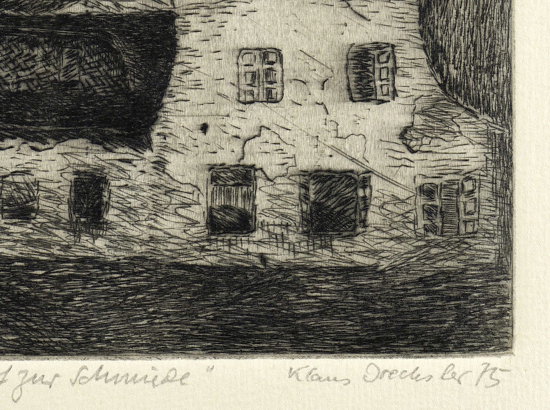 1975. Radierung / Kaltnadel, in Schwarz, auf hartem gelbem Maschinenpapier. – Originale Künstlergrafik, von Klaus Drechsler. – Auflage Exemplar Nr. 2/25. – 18,1 x 22,5 cm (Darstellung / Platte), 30 x 32 cm (Blatt).